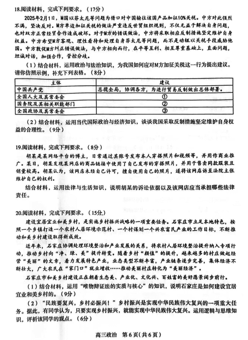 2025届石家庄市高三教学质量检测(一)政治试题及答案