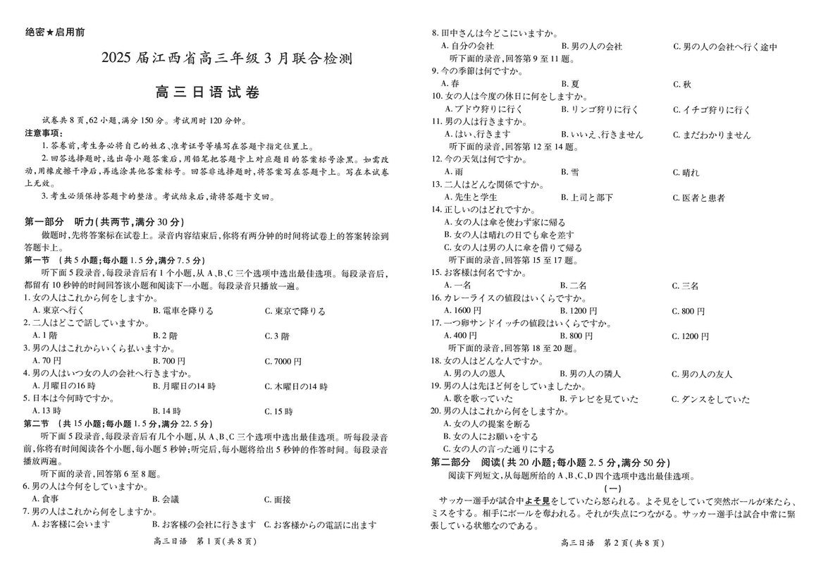 江西省上进联考2024-2025学年高三下学期3月二轮统一调研测日语考试已于近日开考,为方便考生考后及时查看考试情况,查漏补缺、弥补不足,本文整理了试题答案解析相关信息!