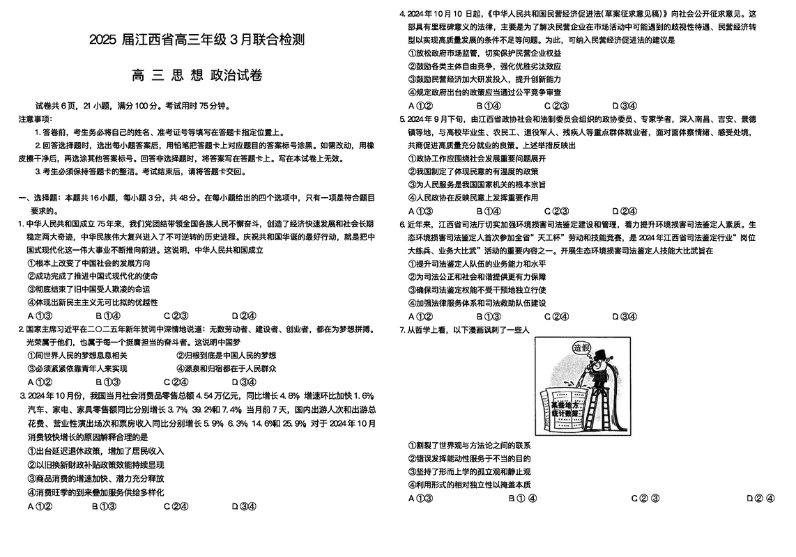 江西上进联考2024-2025学年高三下学期3月二轮统一调研测政治试题及答案