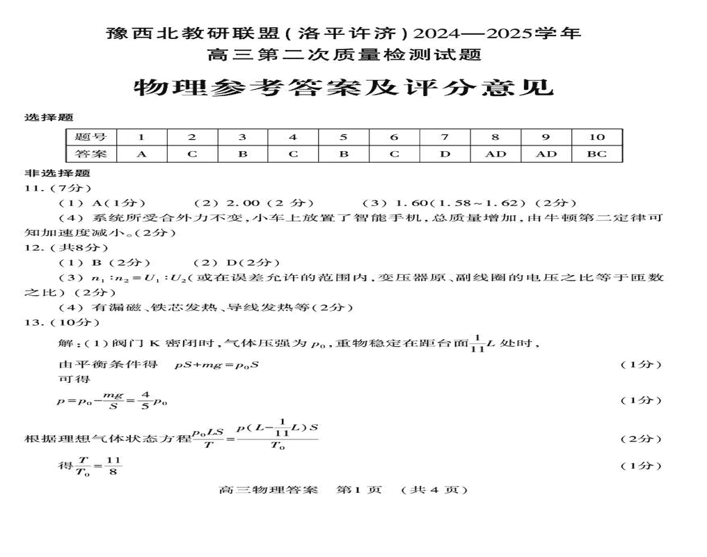 豫西北教研联盟(洛平许济)2025年高三下学期第二次质量检测物理试题及答案