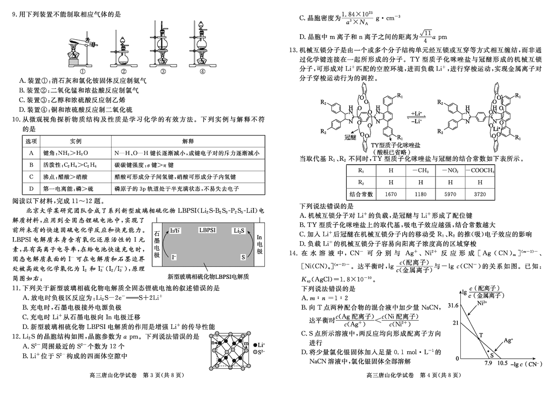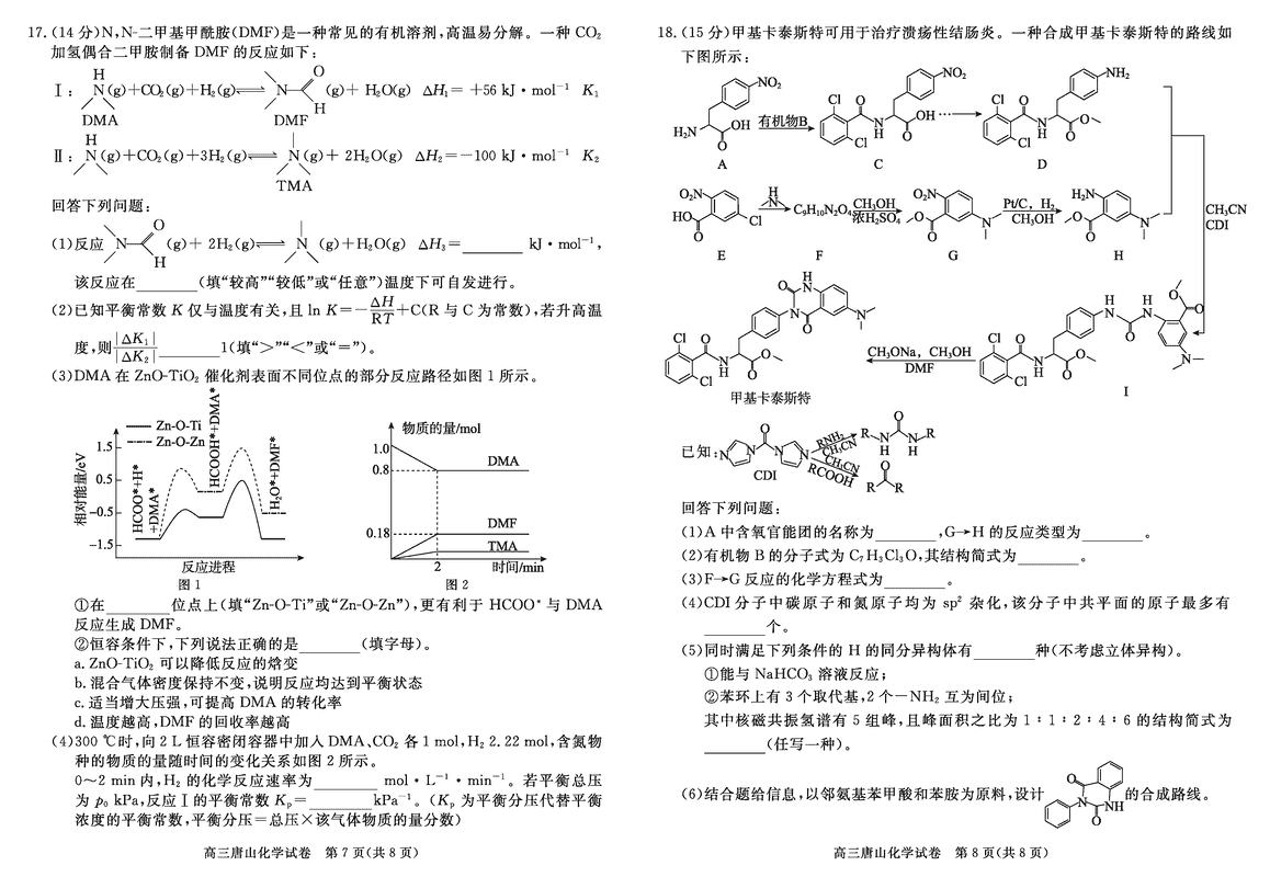 唐山一模2025年普通高等院校招生第一次拟演练化学试题及答案