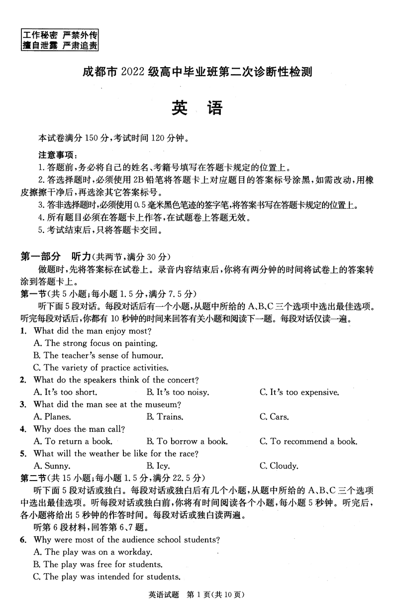 四川成都2025届高三第二次诊断性检测英语考试已于近日开考,为方便考生考后及时查看考试情况,查漏补缺、弥补不足,本文整理了试题答案解析相关信息!