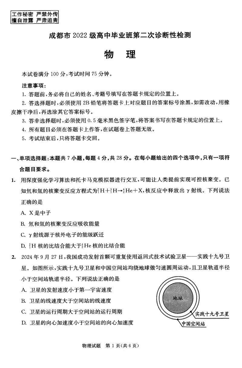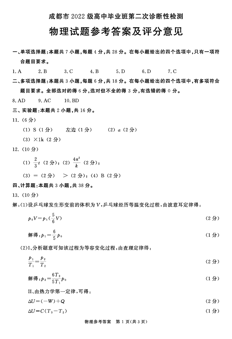 四川成都2025届高三第二次诊断性检测物理考试已于近日开考,为方便考生考后及时查看考试情况,查漏补缺、弥补不足,本文整理了试题答案解析相关信息!