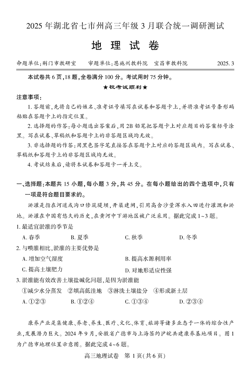 2025年湖北省七市州高三3月联合统一调研测试地理考试已于近日开考,为方便考生考后及时查看考试情况,查漏补缺、弥补不足,本文整理了试题答案解析相关信息!