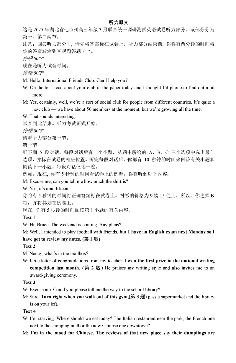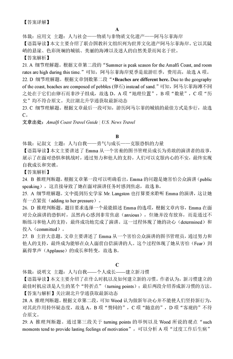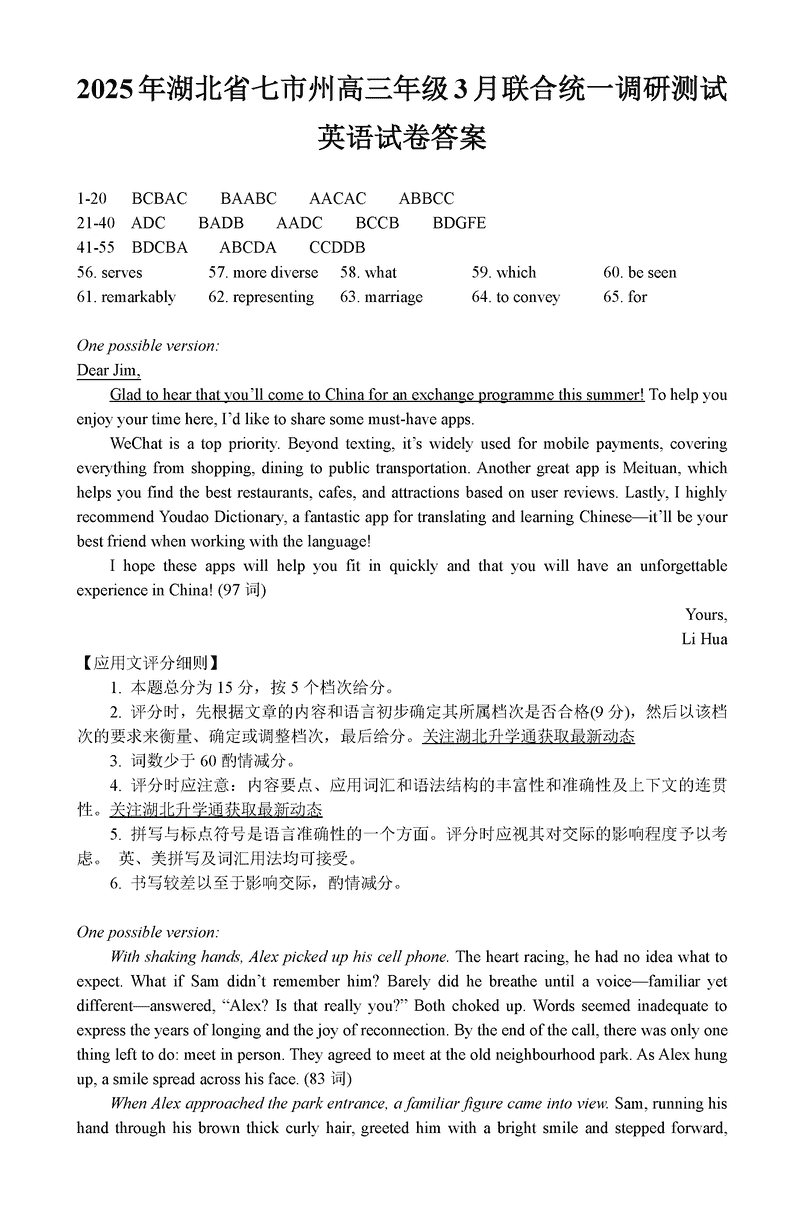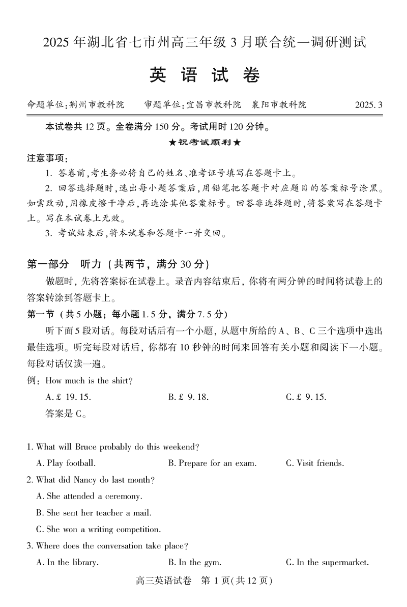 2025年湖北省七市州高三3月联合统一调研测试英语考试已于近日开考,为方便考生考后及时查看考试情况,查漏补缺、弥补不足,本文整理了试题答案解析相关信息!
