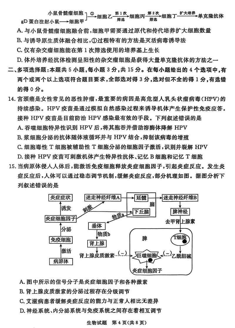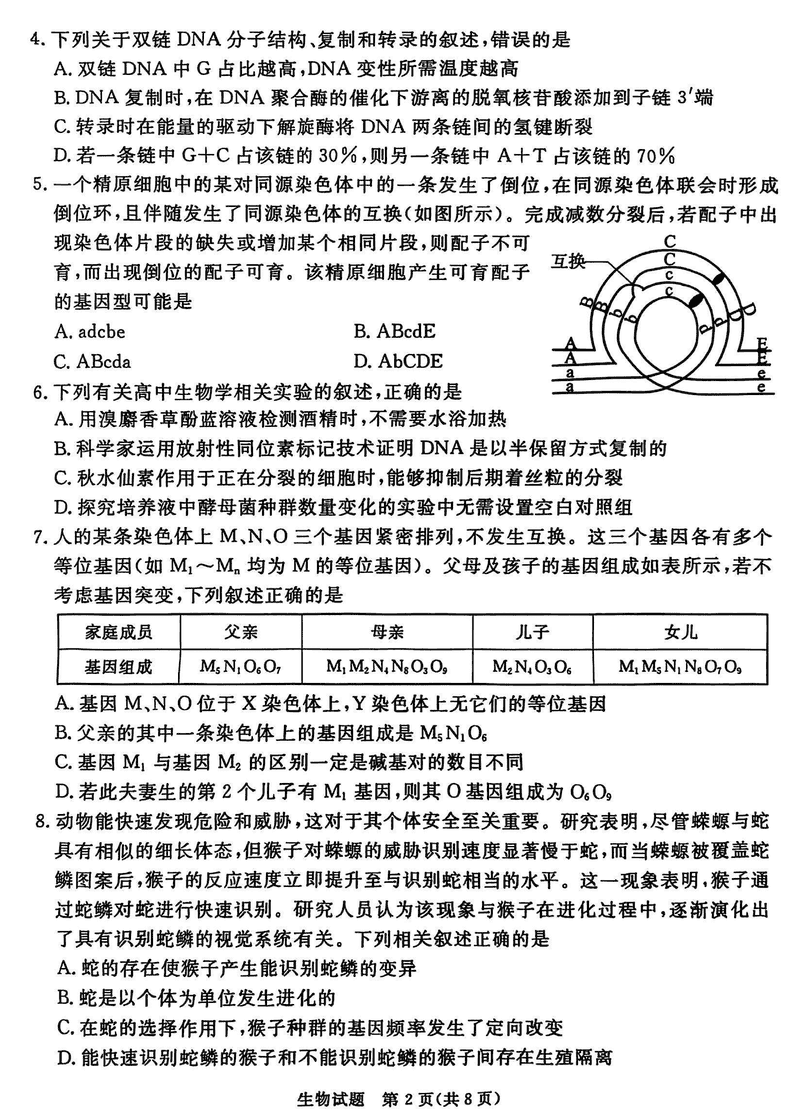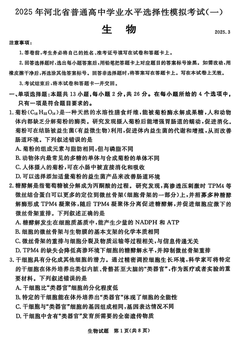 承德、张家口市2025届高三下学期统一模拟考试(一)生物试题及答案