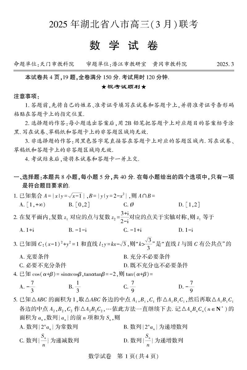 2025年湖北省八市高三3月联考数学试题及答案 时间:2025-03-14 湖北 数学试题 2025年湖北省八市高三3月联考数学考试已于近日开考,为方便考生考后及时查看考试情况,查漏补缺、弥补不足,本文整理了试题答案解析相关信息! 汇总:2025年湖北省八市高三3月联考试题及答案汇总 数学试题及答案解析