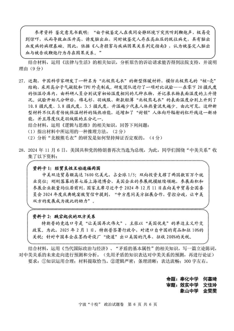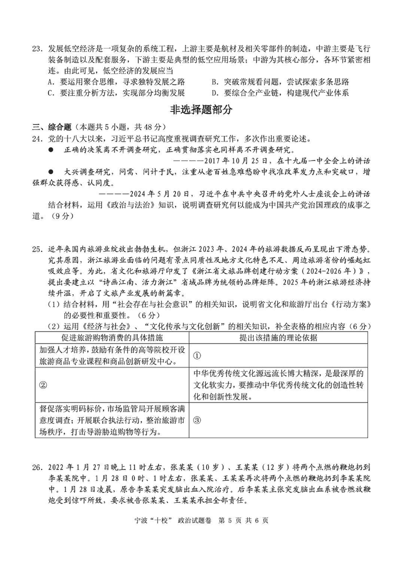 宁波十校2025届高三3月联考政治试题及答案 时间:2025-03-15 浙江 文综试题 宁波十校2025届高三3月联考政治考试已于近日开考,为方便考生考后及时查看考试情况,查漏补缺、弥补不足,本文整理了试题答案解析相关信息! 汇总:宁波十校2025届高三3月联考试题及答案汇总 政治试题及答案解析