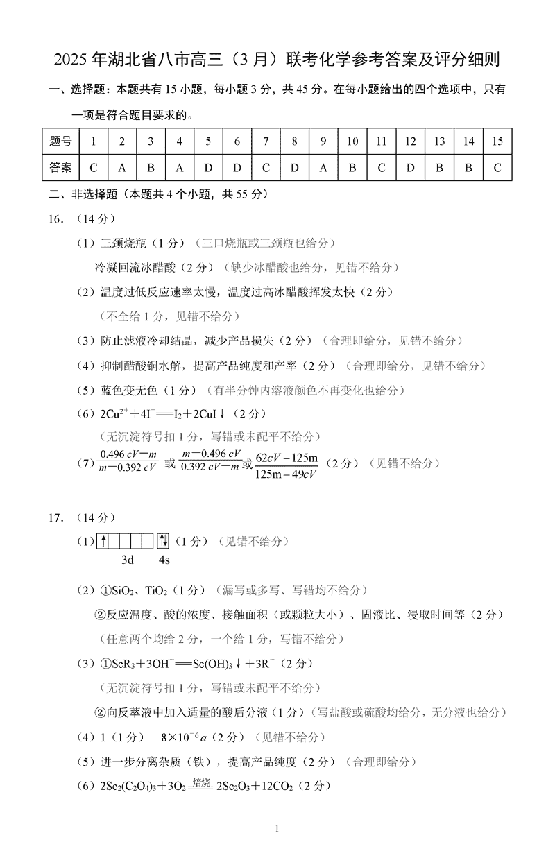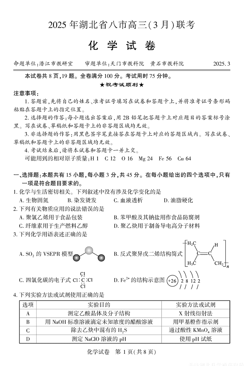 2025年湖北省八市高三3月联考化学试题及答案 时间:2025-03-15 湖北 理综试题 2025年湖北省八市高三3月联考化学考试已于近日开考,为方便考生考后及时查看考试情况,查漏补缺、弥补不足,本文整理了试题答案解析相关信息! 汇总:2025年湖北省八市高三3月联考试题及答案汇总 化学试题及答案解析