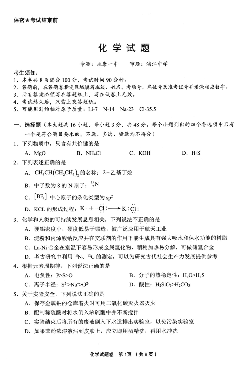 金丽衢十二校2025届高三第二次联考化学试题及答案