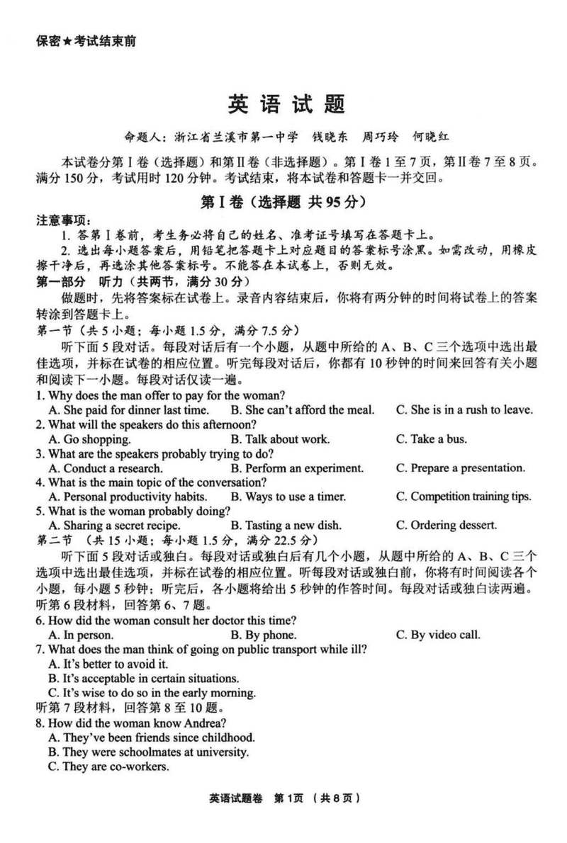 浙江省金丽衢十二校2025届高三第二次联考英语考试已于近日开考,为方便考生考后及时查看考试情况,查漏补缺、弥补不足,本文整理了试题答案解析相关信息!