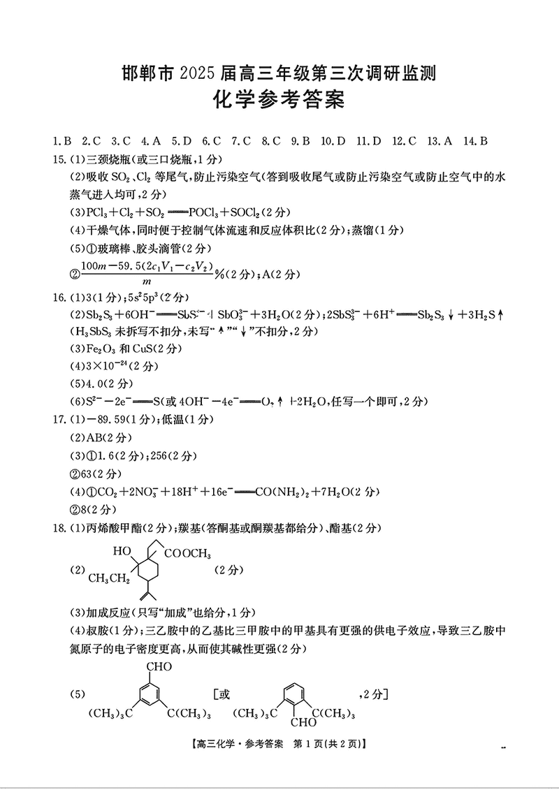 邯郸市2025届高三年级第三次调研监测化学试题及答案