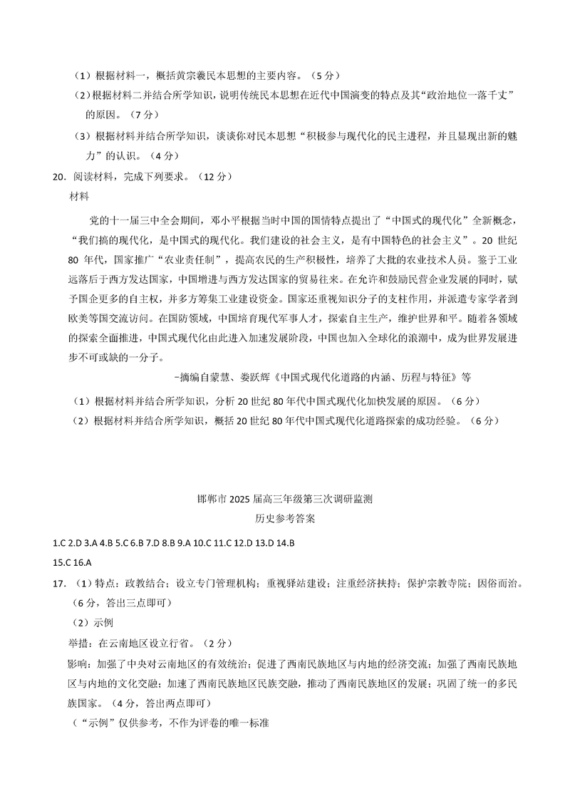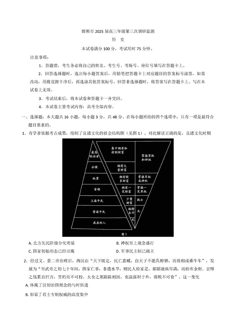 邯郸市2025届高三年级第三次调研监测历史试题及答案 时间:2025-03-15 河北 文综试题 邯郸市2025届高三年级第三次调研监测历史考试已于近日开考,为方便考生考后及时查看考试情况,查漏补缺、弥补不足,本文整理了试题答案解析相关信息! 汇总:邯郸市2025届高三年级第三次调研监测试题及答案汇总 历史试题及答案解析