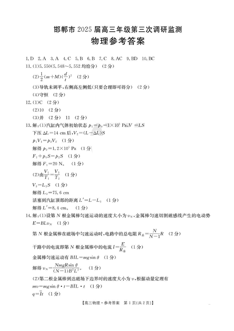 邯郸市2025届高三年级第三次调研监测物理试题及答案 时间:2025-03-15 河北 理综试题 邯郸市2025届高三年级第三次调研监测物理考试已于近日开考,为方便考生考后及时查看考试情况,查漏补缺、弥补不足,本文整理了试题答案解析相关信息! 汇总:邯郸市2025届高三年级第三次调研监测试题及答案汇总 物理试题及答案解析
