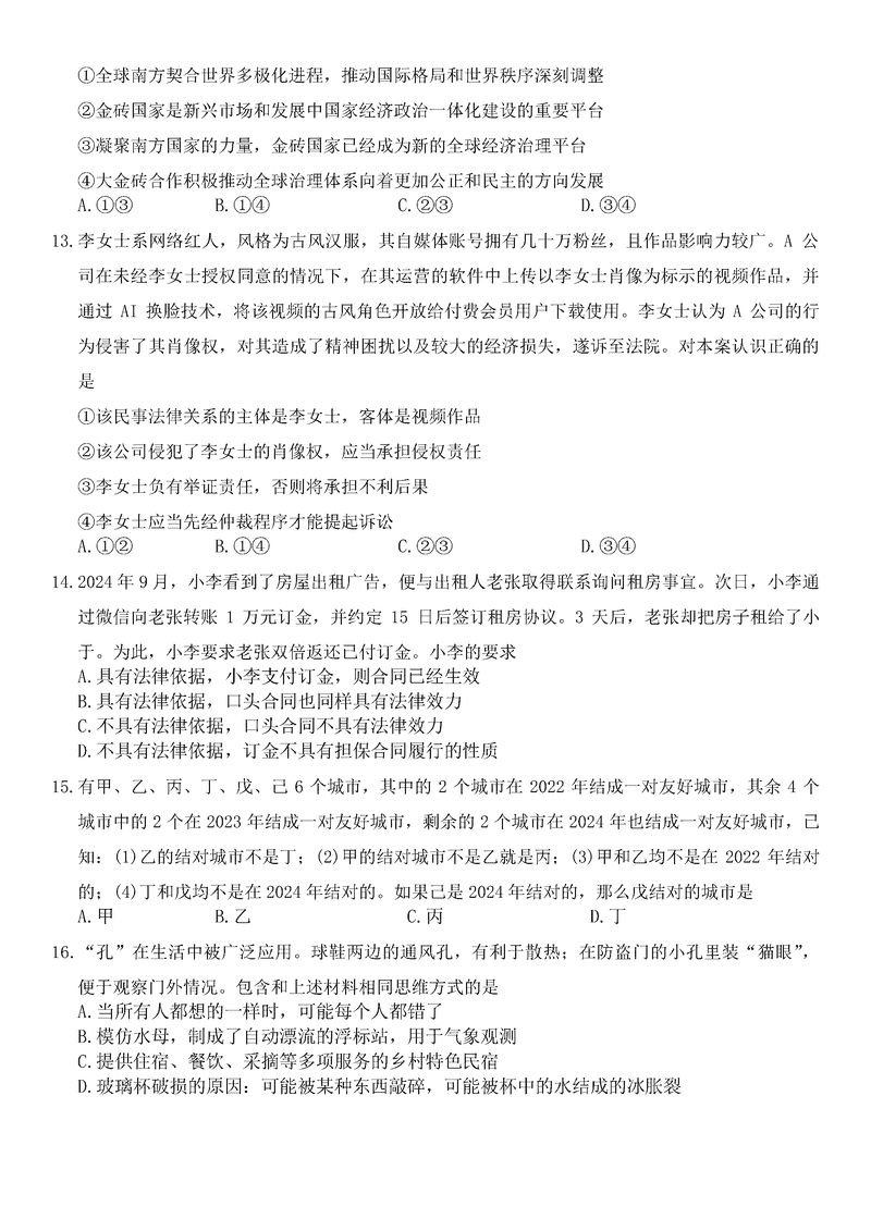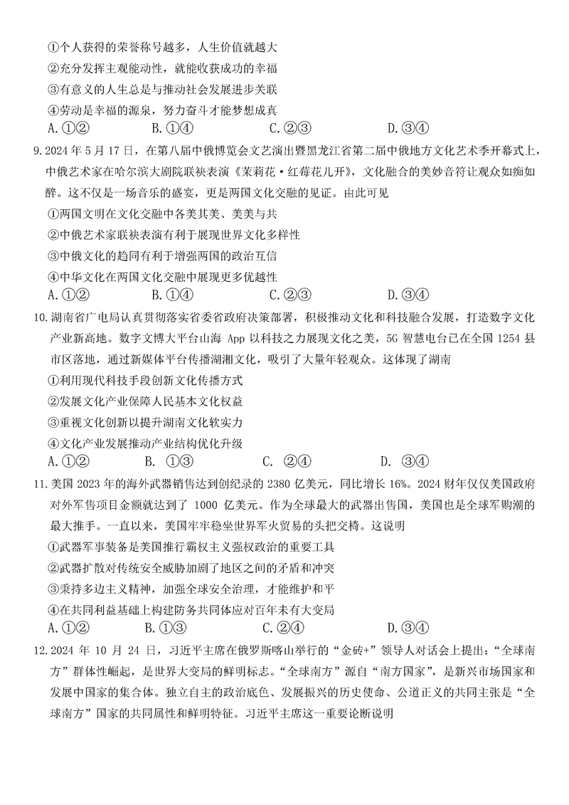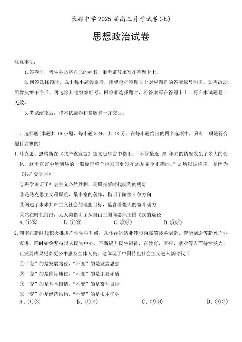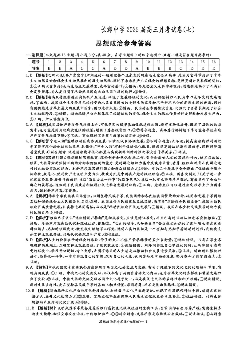 湖南长郡中学2025届高三月考试卷(七)政治试题及答案