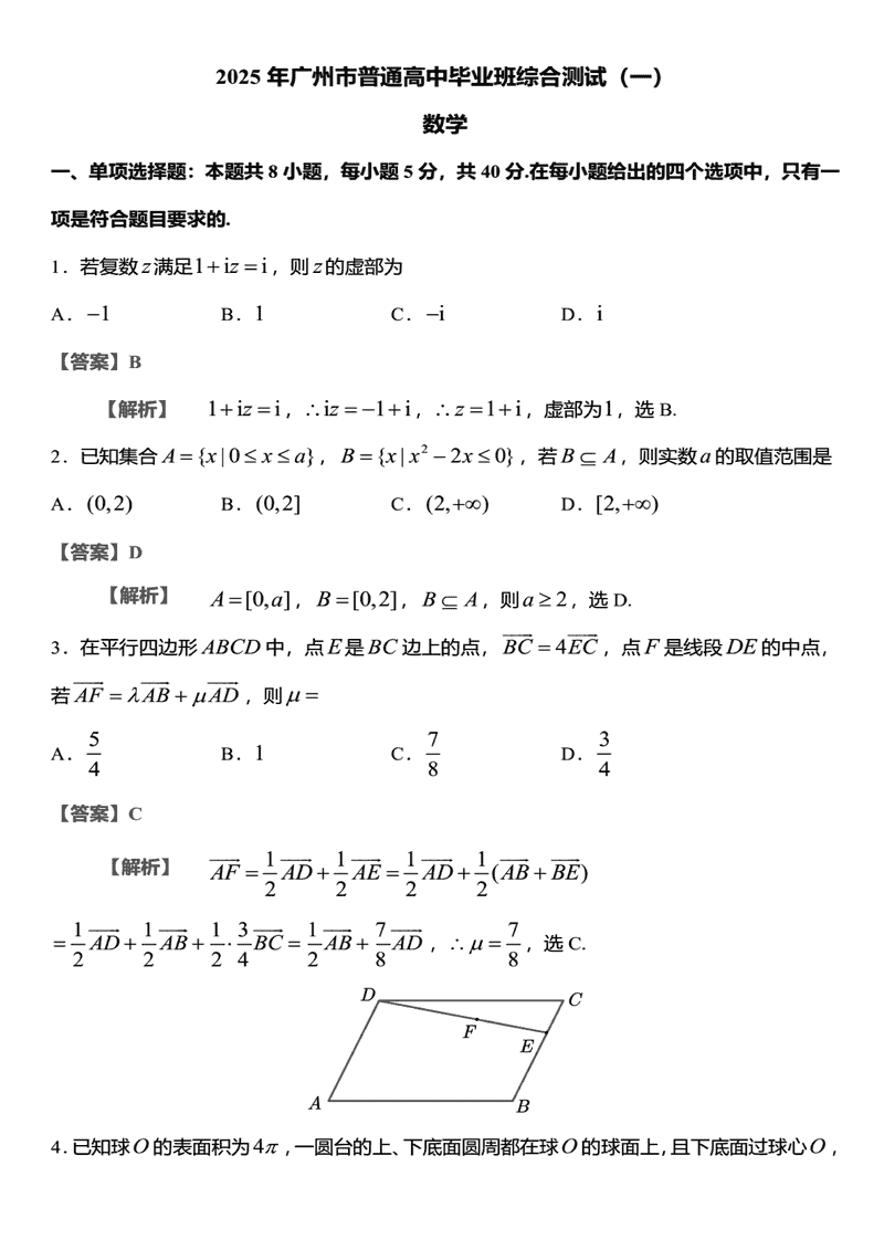 2025年广州市普通高中毕业班综合测试(一)数学试题及答案