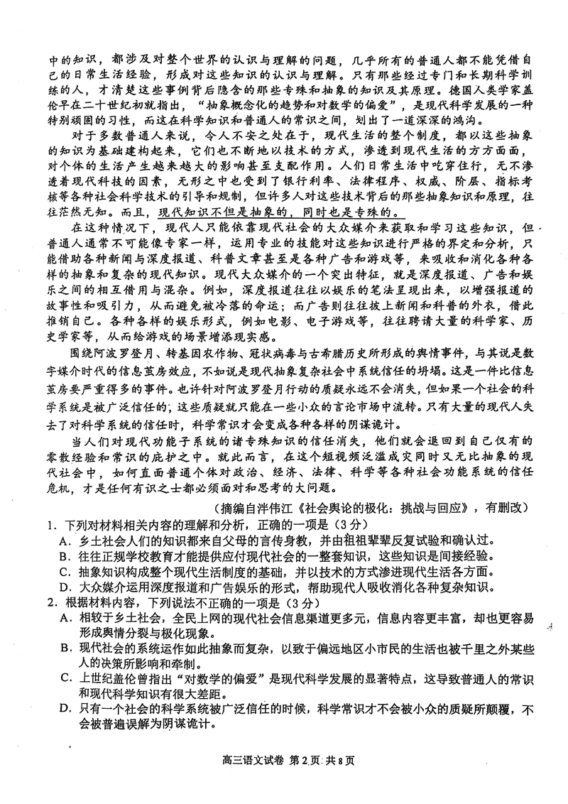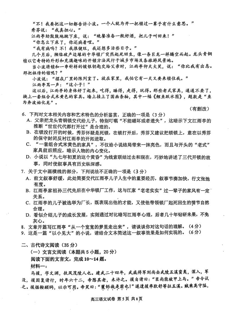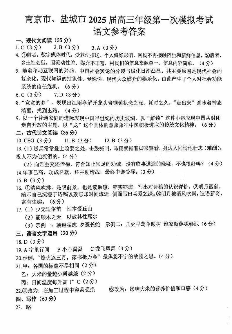 南京市、盐城市2025届高三一模语文试题及答案 时间:2025-03-20 江苏 语文试题 南京市、盐城市2025届高三一模语文考试已于近日开考,为方便考生考后及时查看考试情况,查漏补缺、弥补不足,本文整理了试题答案解析相关信息! 汇总:南京市、盐城市2025届高三一模试题及答案汇总 语文试题及答案解析