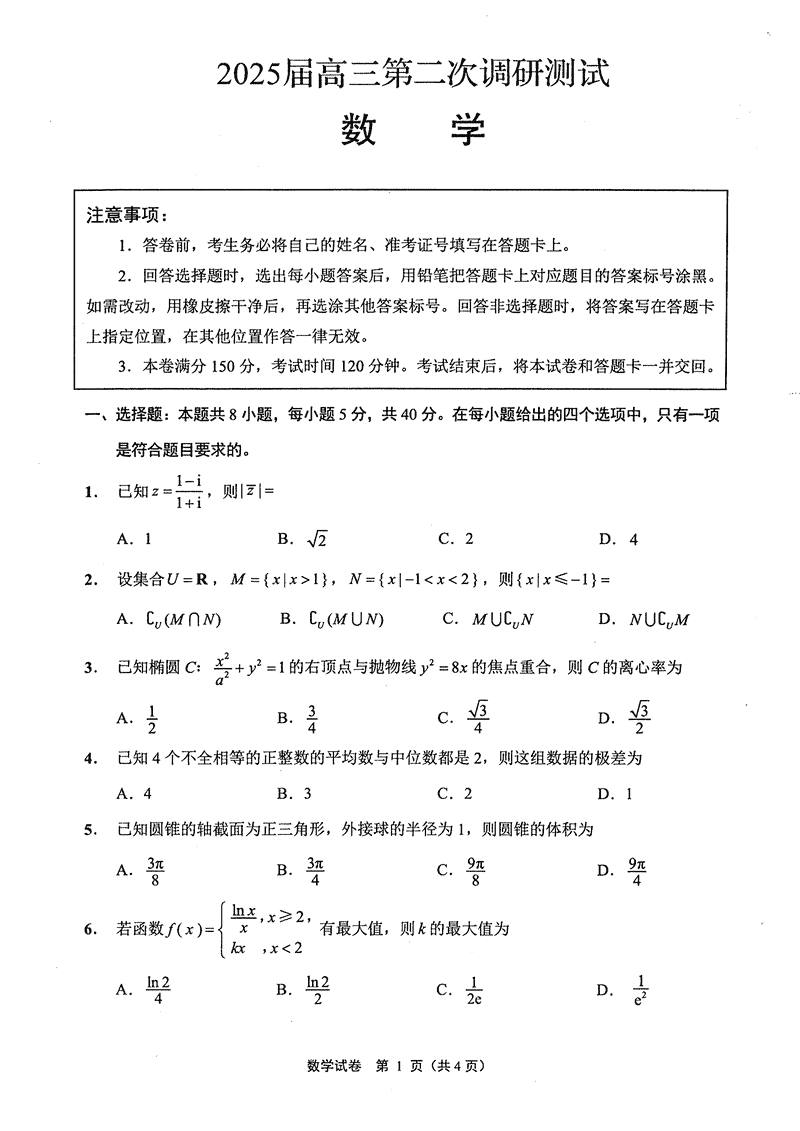2025届江苏苏北七市高三第二次调研数学试题及答案 时间:2025-03-20 江苏 数学试题 2025届江苏苏北七市高三第二次调研数学考试已于近日开考,为方便考生考后及时查看考试情况,查漏补缺、弥补不足,本文整理了试题答案解析相关信息! 汇总:2025届江苏苏北七市高三第二次调研试题及答案汇总 数学试题及答案解析