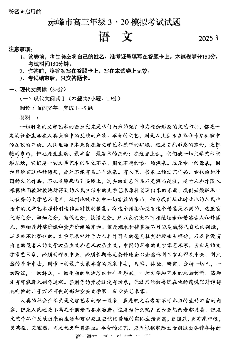 赤峰二模2025届高三下学期3·20模考语文试题及答案