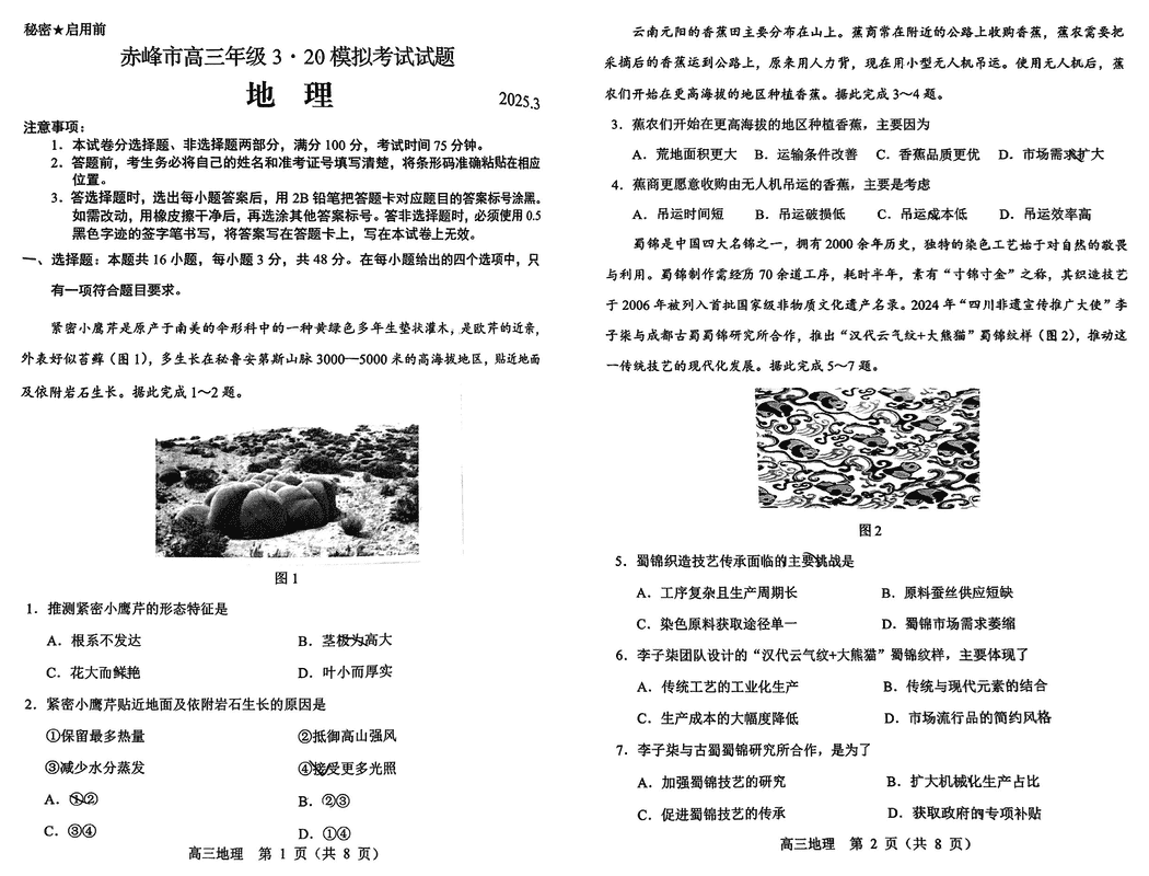 赤峰二模2025届高三下学期3·20模考地理试题及答案