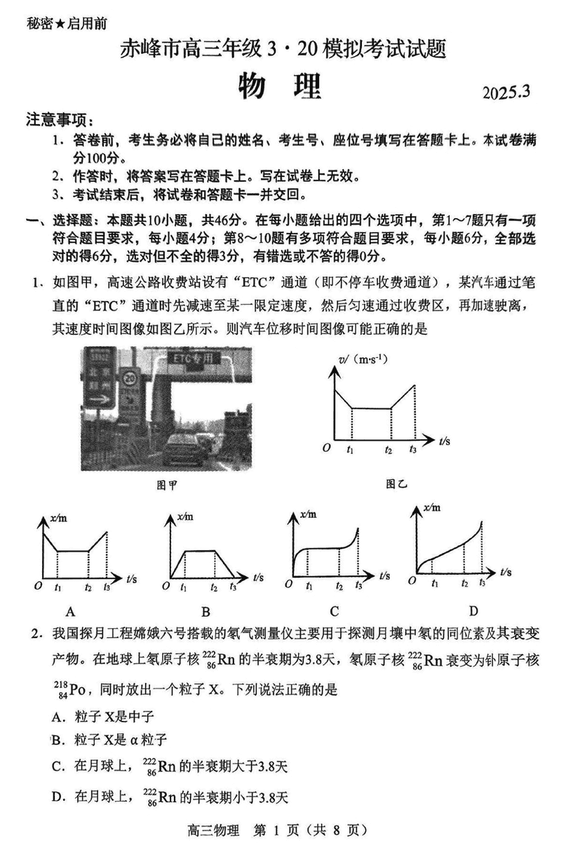赤峰二模2025届高三下学期3·20模考物理试题及答案