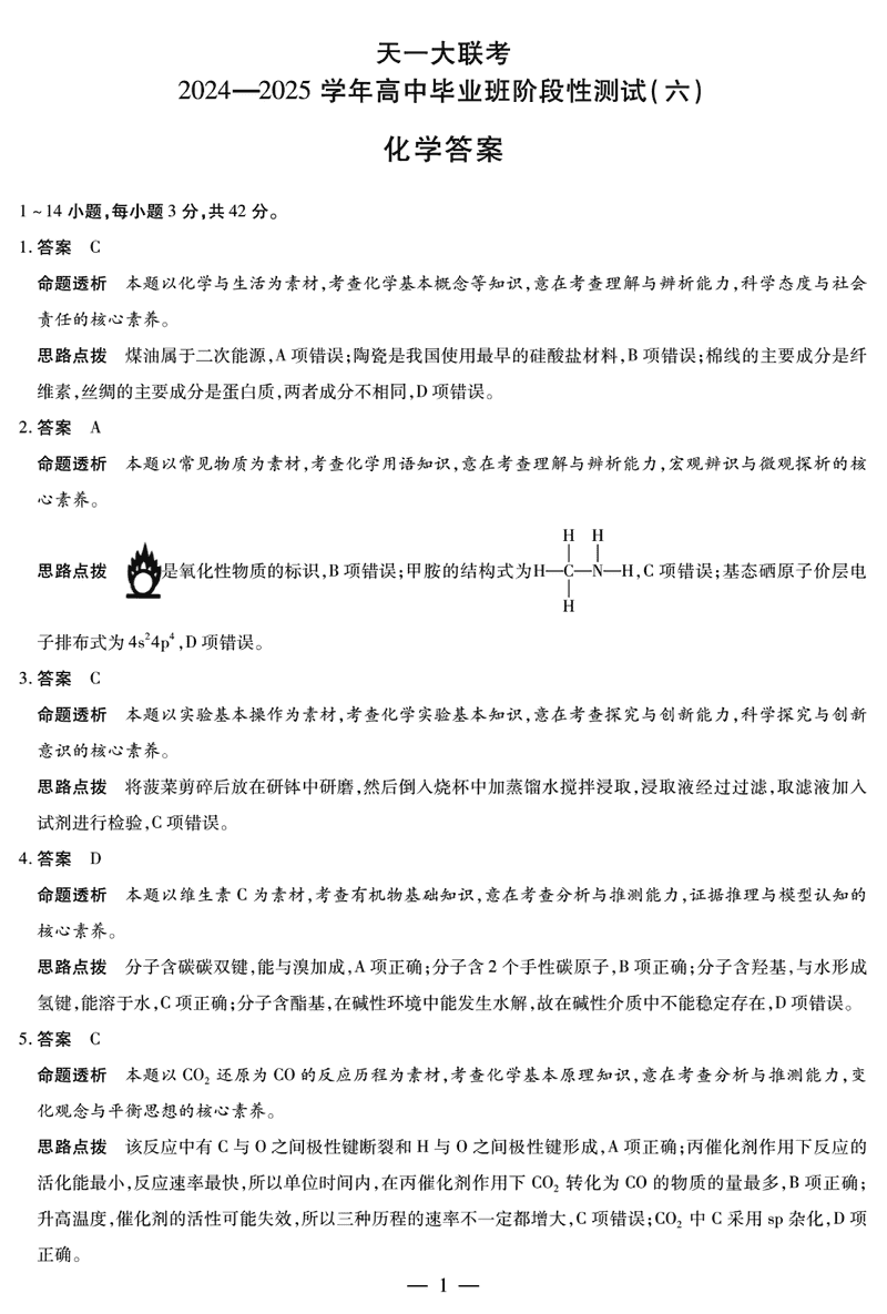 河南省天一大联考2024-2025学年高三阶段性测试(六)化学考试已于近日开考,为方便考生考后及时查看考试情况,查漏补缺、弥补不足,本文整理了试题答案解析相关信息!