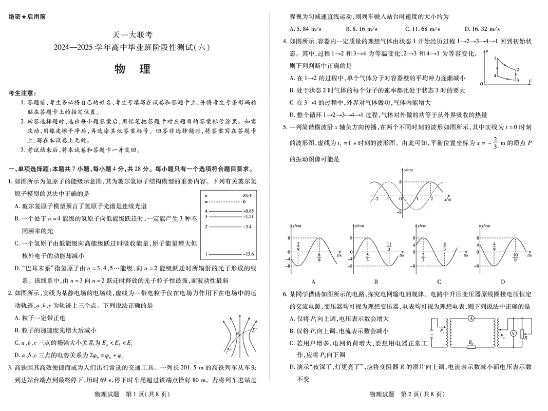 河南省天一大联考2024-2025学年高三阶段性测试(六)物理试题及答案