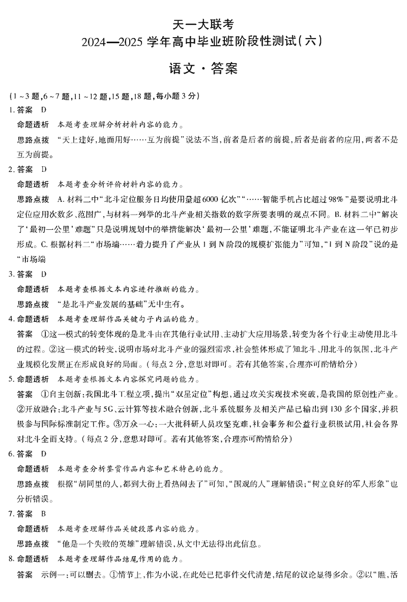 河南省天一大联考2024-2025学年高三阶段性测试(六)语文考试已于近日开考,为方便考生考后及时查看考试情况,查漏补缺、弥补不足,本文整理了试题答案解析相关信息!