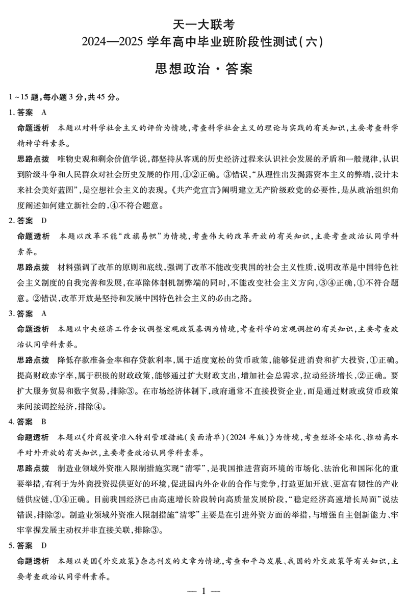 河南省天一大联考2024-2025学年高三阶段性测试(六)政治考试已于近日开考,为方便考生考后及时查看考试情况,查漏补缺、弥补不足,本文整理了试题答案解析相关信息!