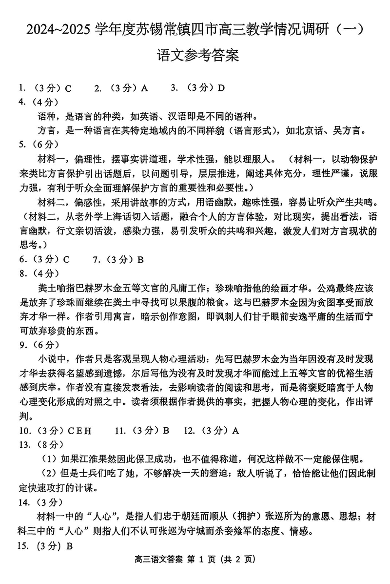 2025届苏锡常镇四市一模高三下学期教学情况调研(一)语文考试已于近日开考,为方便考生考后及时查看考试情况,查漏补缺、弥补不足,本文整理了试题答案解析相关信息!