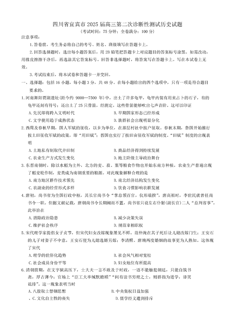 乐山市、自贡市、宜宾市2025届高三第二次诊断考历史试题及答案