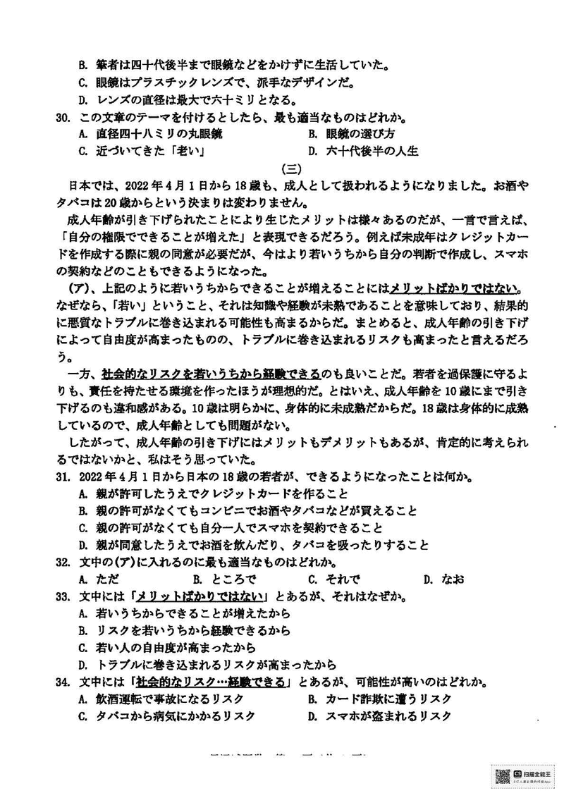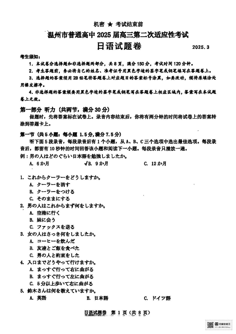 温州市2025届高三下学3月二模日语试题及答案 时间:2025-03-24 英语试题 温州市2025届高三下学3月二模日语考试已于近日开考,为方便考生考后及时查看考试情况,查漏补缺、弥补不足,本文整理了试题答案解析相关信息! 汇总:温州市2025届高三下学3月二模试题及答案汇总 日语试题及答案解析