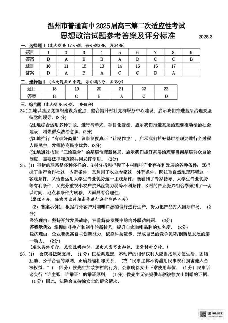 温州市2025届高三下学3月二模政治试题及答案 时间:2025-03-24 浙江 文综试题 温州市2025届高三下学3月二模政治考试已于近日开考,为方便考生考后及时查看考试情况,查漏补缺、弥补不足,本文整理了试题答案解析相关信息! 汇总:温州市2025届高三下学3月二模试题及答案汇总 政治试题及答案解析