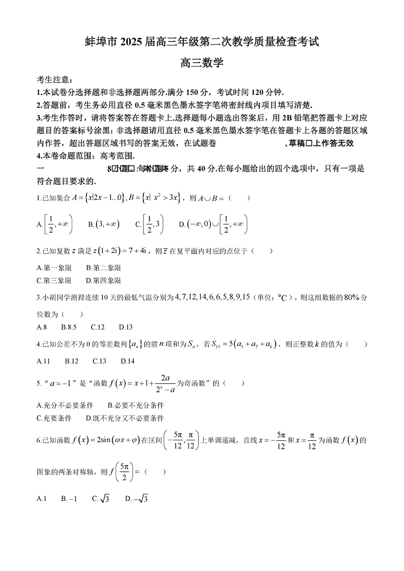 蚌埠市2025届高三第二次教学质检数学试题及答案 时间:2025-03-24 安徽 数学试题 蚌埠市2025届高三第二次教学质检数学考试已于近日开考,为方便考生考后及时查看考试情况,查漏补缺、弥补不足,本文整理了试题答案解析相关信息! 汇总:蚌埠市2025届高三第二次教学质量检查试题及答案汇总 数学试题及答案解析