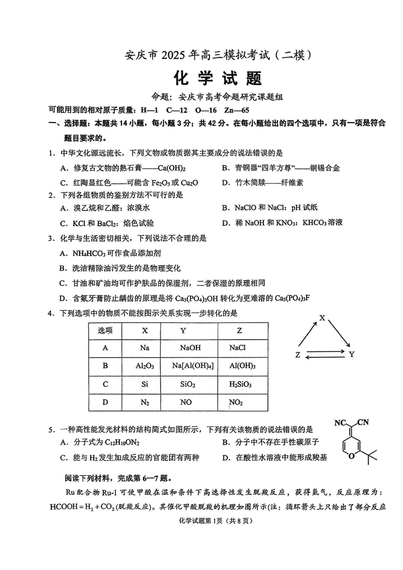 安徽安庆2025届高三二模化学试题及答案 时间:2025-03-24 安徽 理综试题 安徽安庆2025届高三二模化学考试已于近日开考,为方便考生考后及时查看考试情况,查漏补缺、弥补不足,本文整理了试题答案解析相关信息! 汇总:安徽安庆2025届高三二模试题及答案汇总 化学试题及答案解析