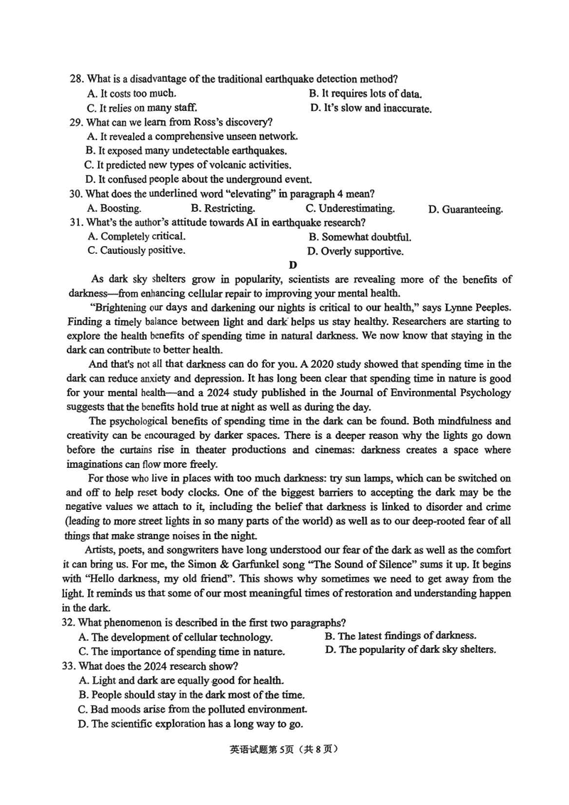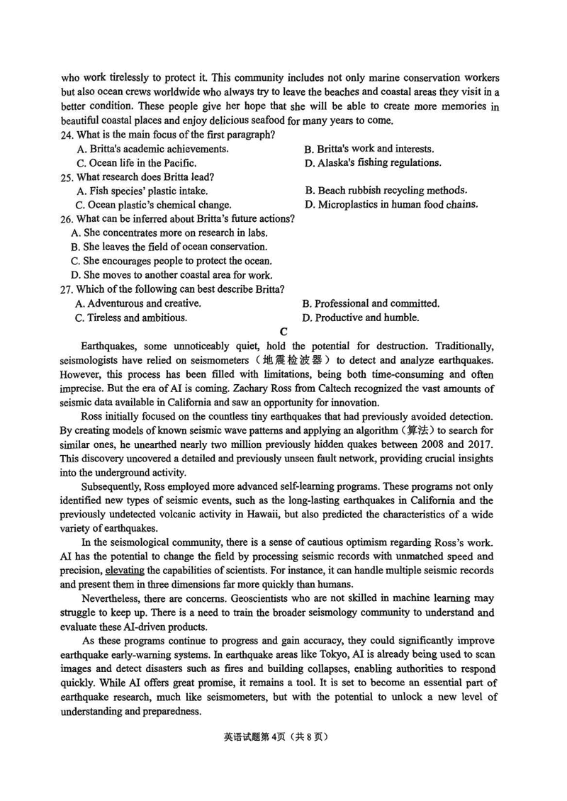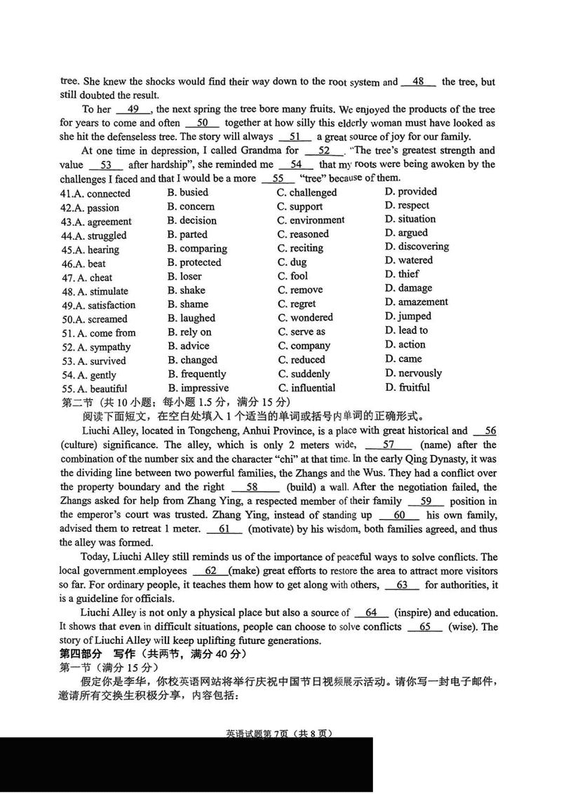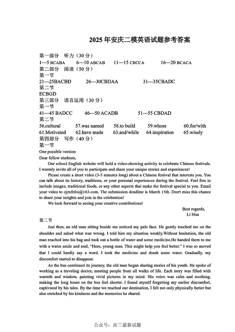 安徽安庆2025届高三二模英语试题及答案 时间:2025-03-24 安徽 英语试题 安徽安庆2025届高三二模英语考试已于近日开考,为方便考生考后及时查看考试情况,查漏补缺、弥补不足,本文整理了试题答案解析相关信息! 汇总:安徽安庆2025届高三二模试题及答案汇总 英语试题及答案解析