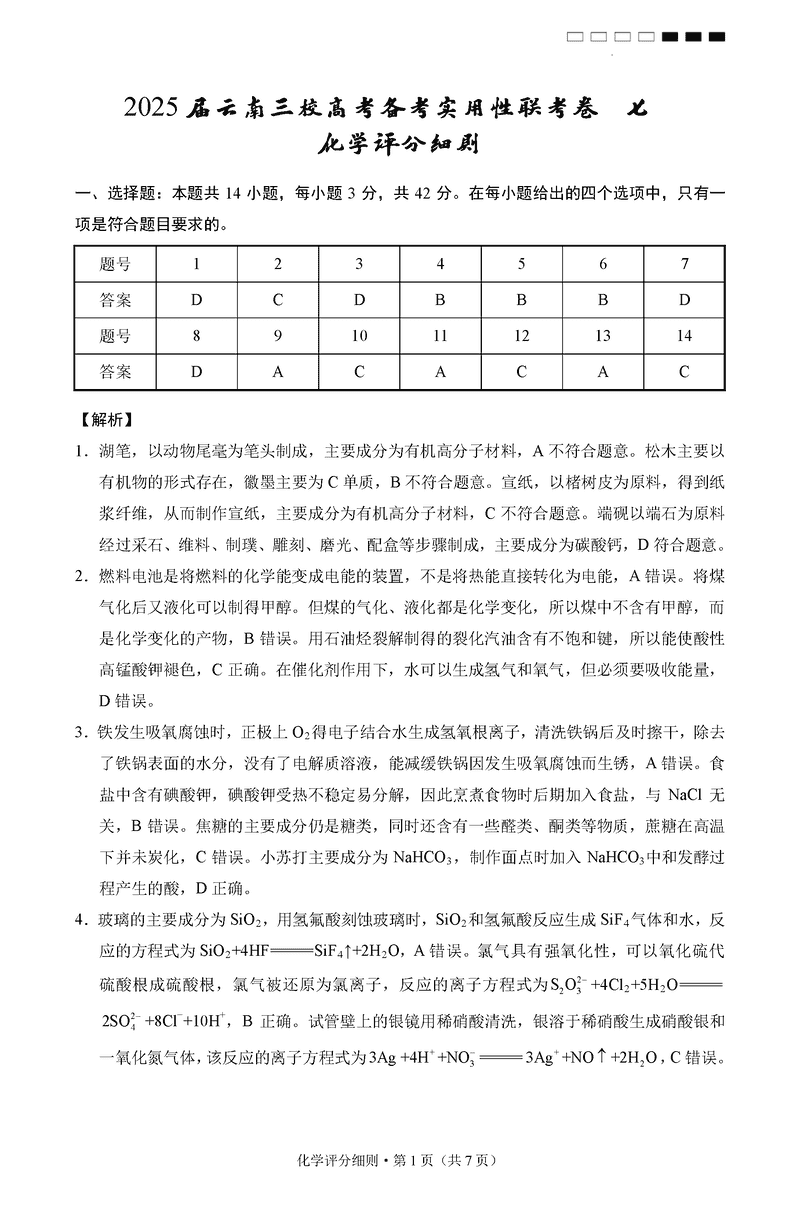 2025届云南三校高三高考备考实用性联考卷(七)化学考试已于近日开考,为方便考生考后及时查看考试情况,查漏补缺、弥补不足,本文整理了试题答案解析相关信息!