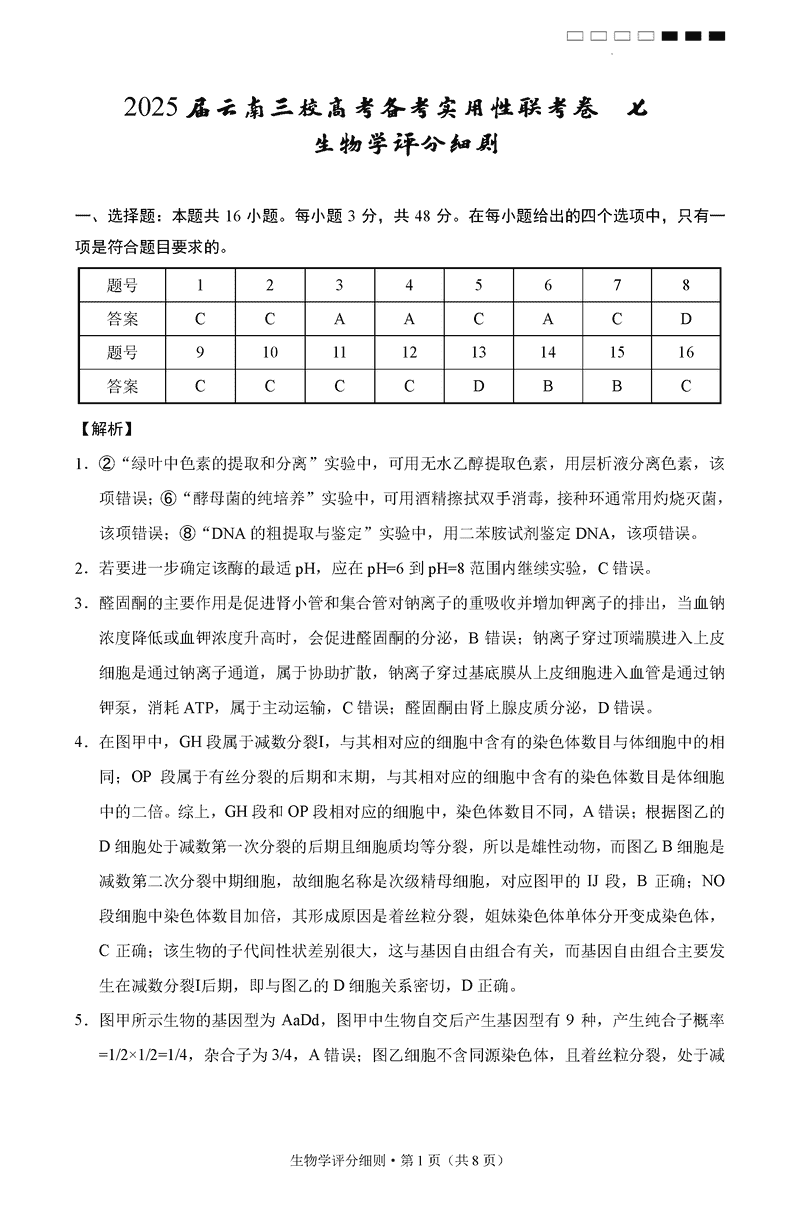 2025届云南三校高三高考备考实用性联考卷(七)生物考试已于近日开考,为方便考生考后及时查看考试情况,查漏补缺、弥补不足,本文整理了试题答案解析相关信息!