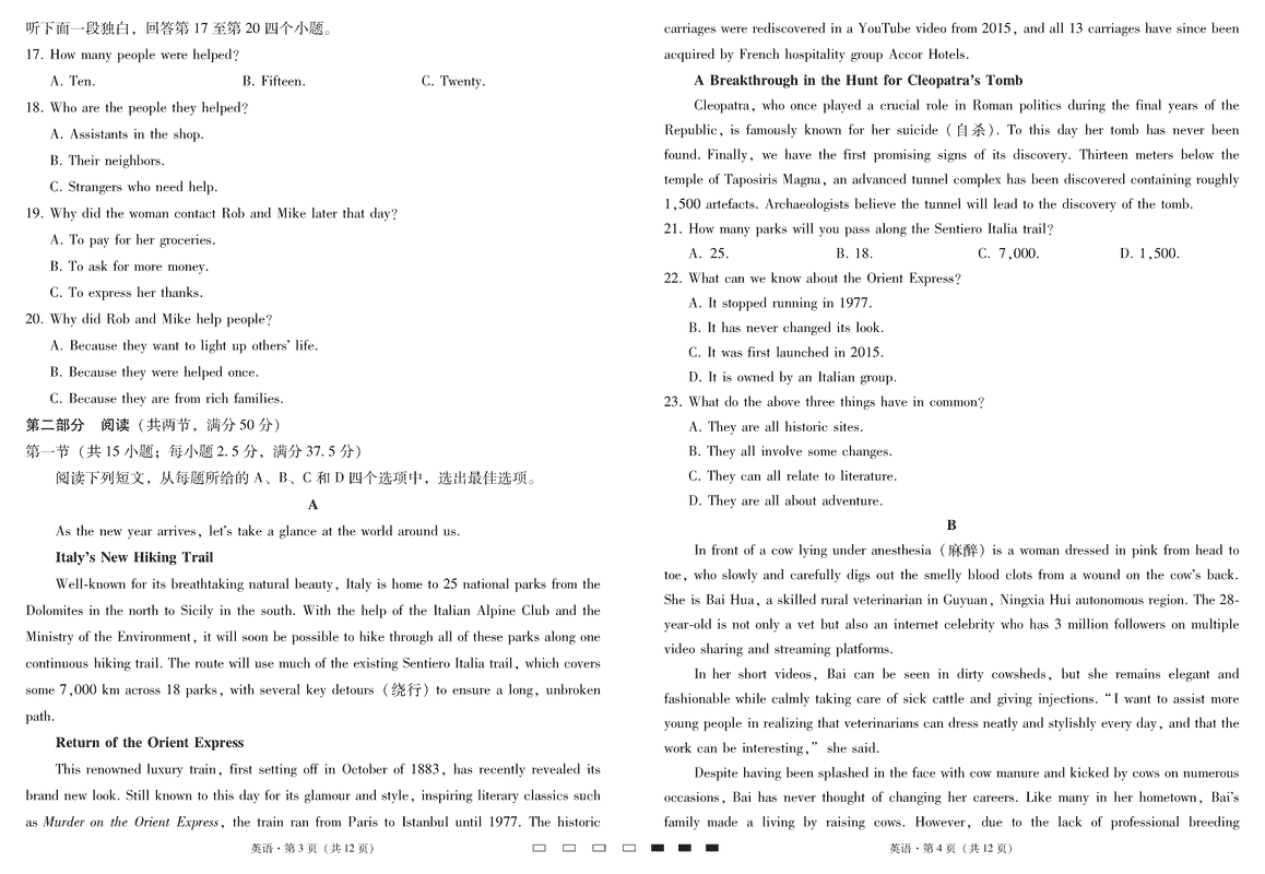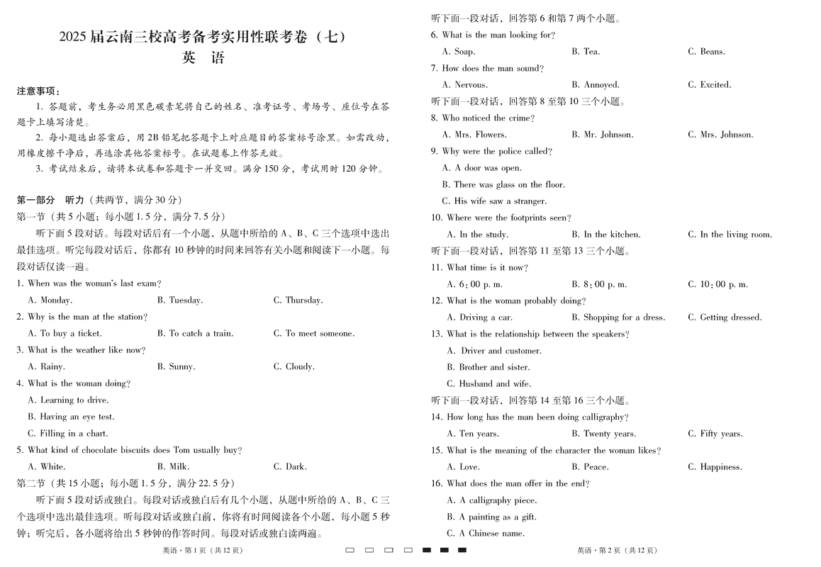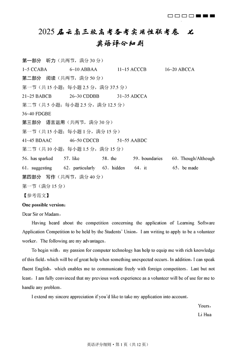 2025届云南三校高三高考备考实用性联考卷(七)英语考试已于近日开考,为方便考生考后及时查看考试情况,查漏补缺、弥补不足,本文整理了试题答案解析相关信息!