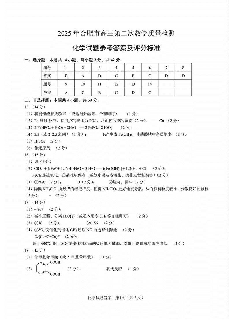 合肥二模2025届高三第二次教学质检化学考试已于近日开考,为方便考生考后及时查看考试情况,查漏补缺、弥补不足,本文整理了试题答案解析相关信息!