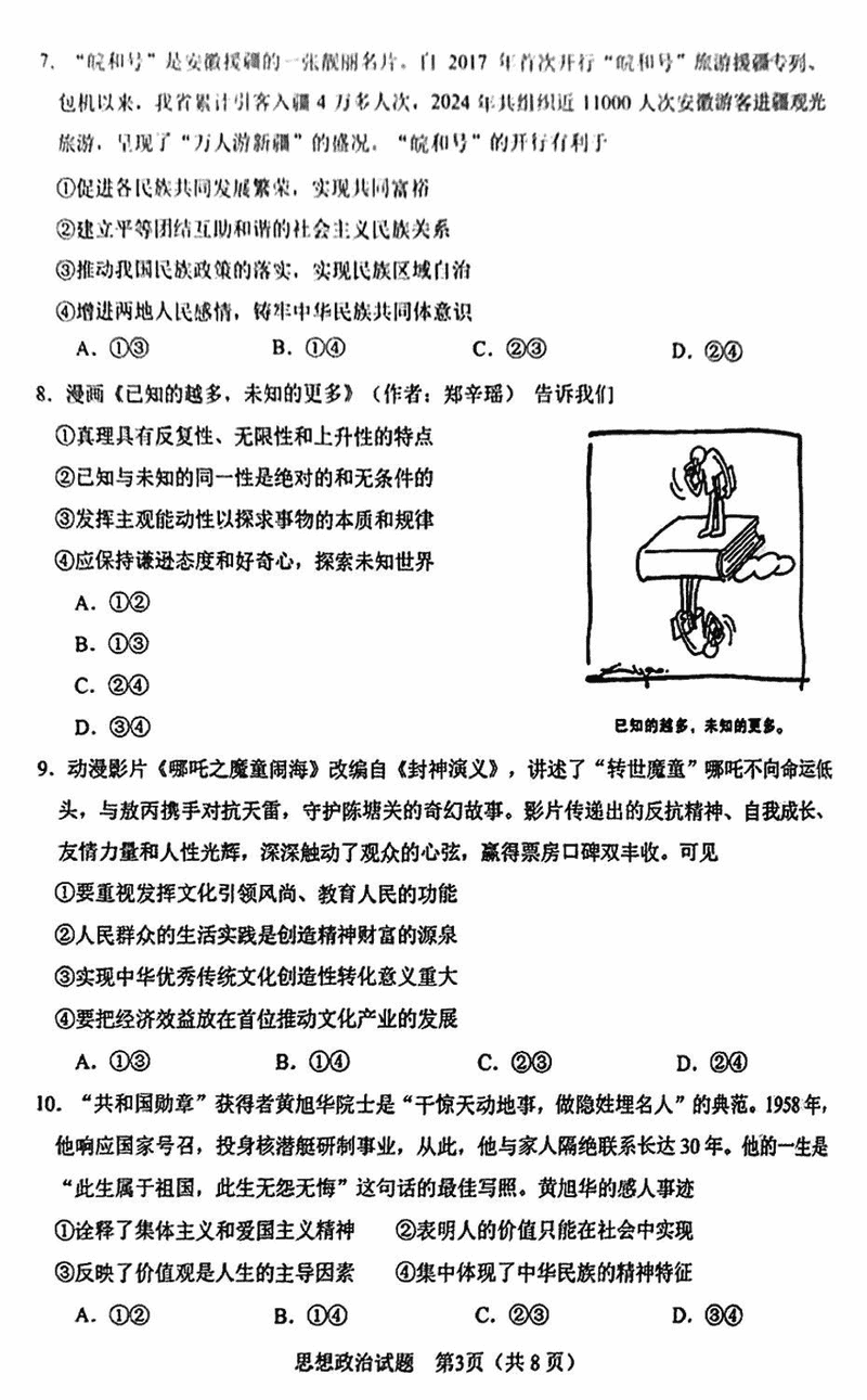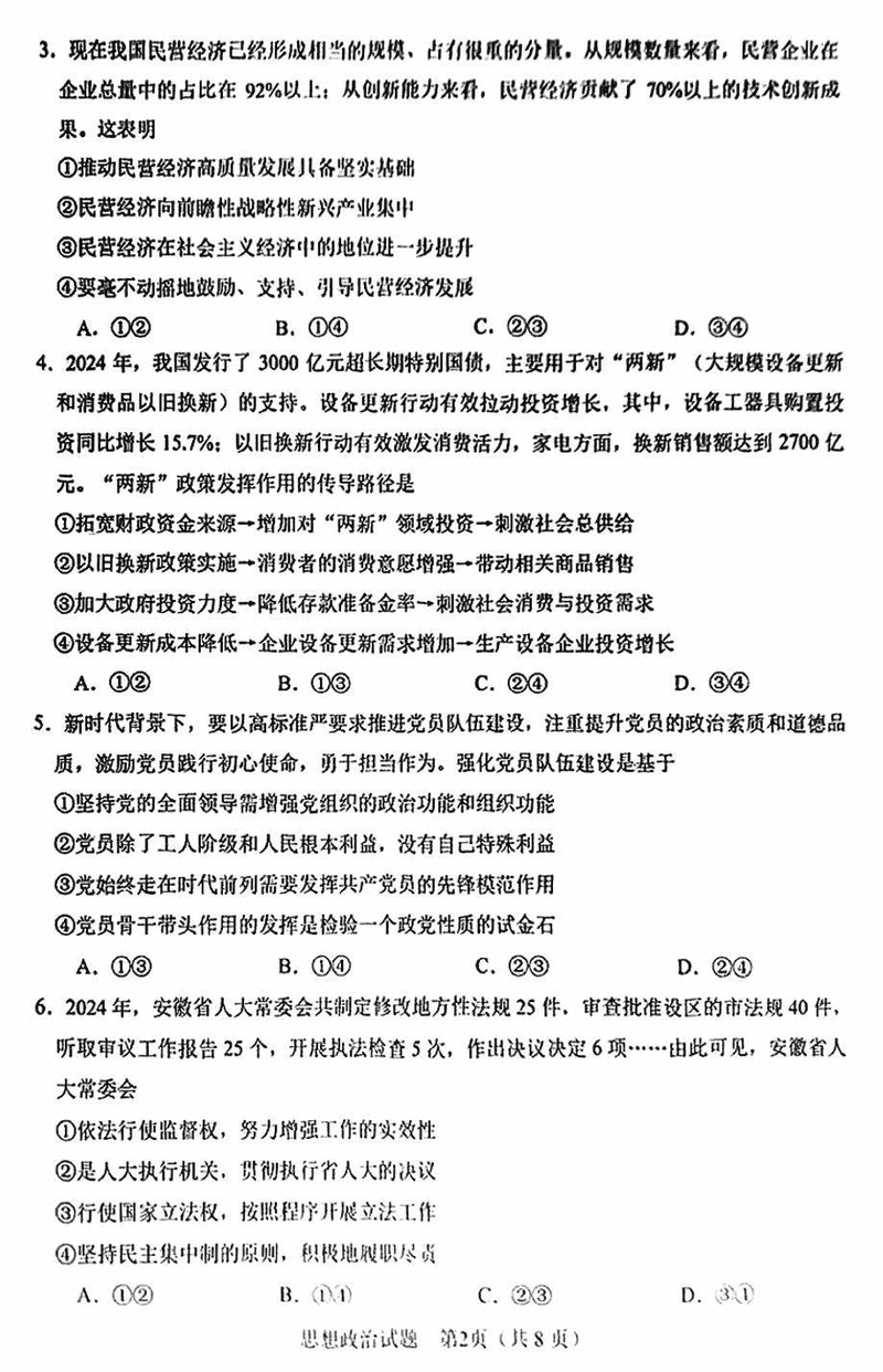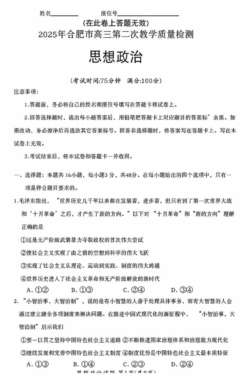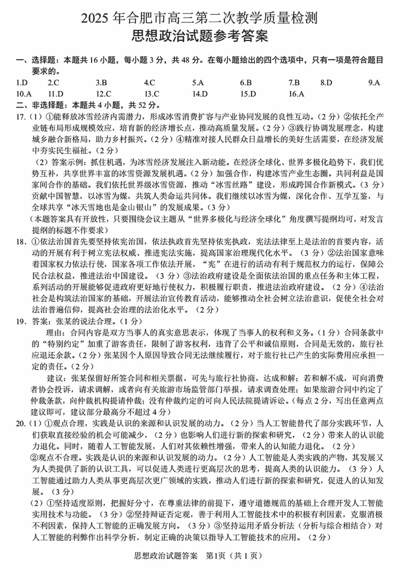 合肥二模2025届高三第二次教学质检政治试题及答案汇总