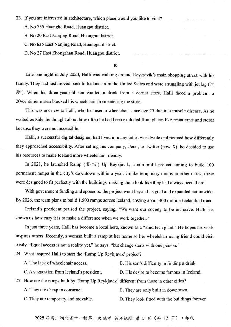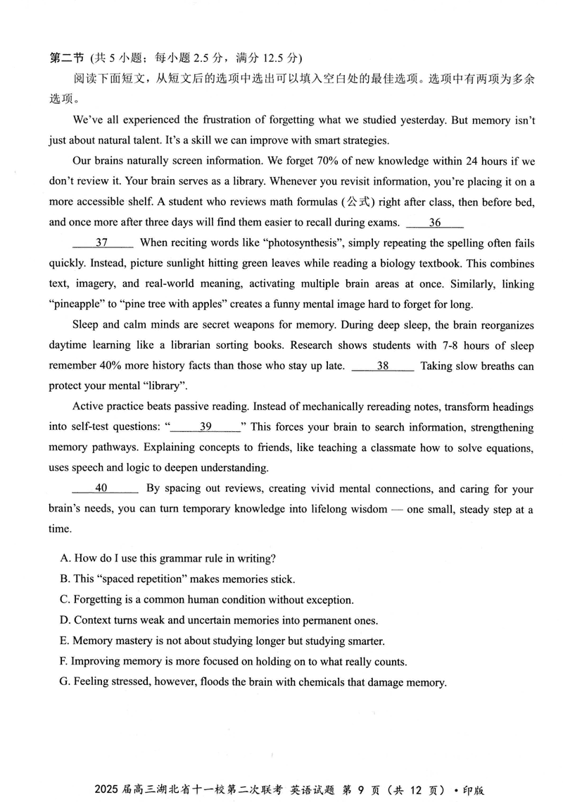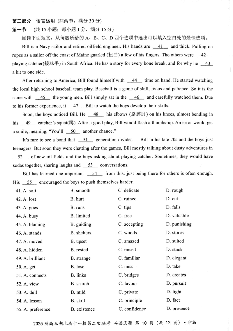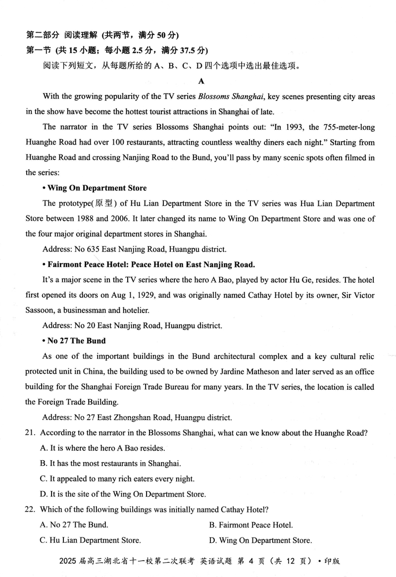 湖北省十一校2025届高三第二次联考英语试题及答案汇总 时间:2025-03-27 湖北 英语试题 湖北省十一校2025届高三第二次联考英语考试已于近日开考,为方便考生考后及时查看考试情况,查漏补缺、弥补不足,本文整理了试题答案解析相关信息! 汇总:湖北省十一校2025届高三第二次联考试题及答案汇总 英语试题及答案解析