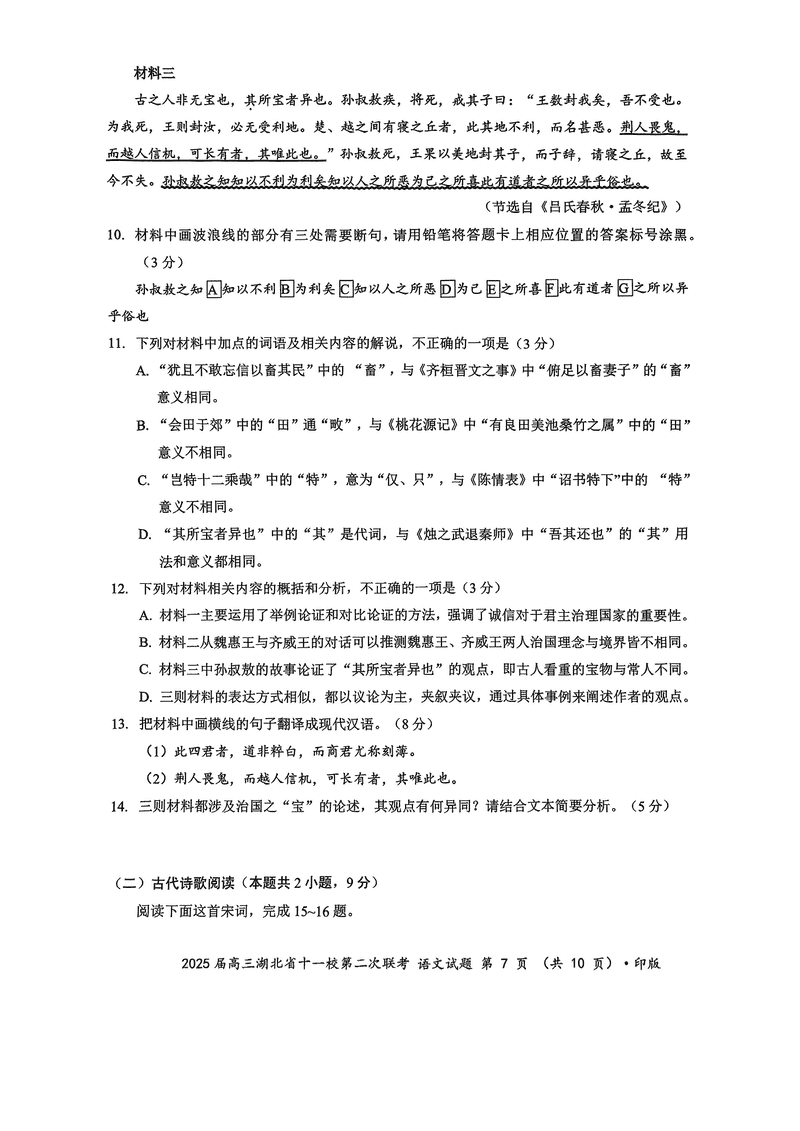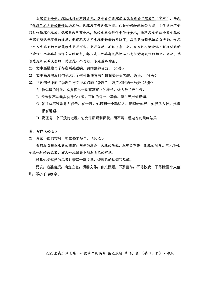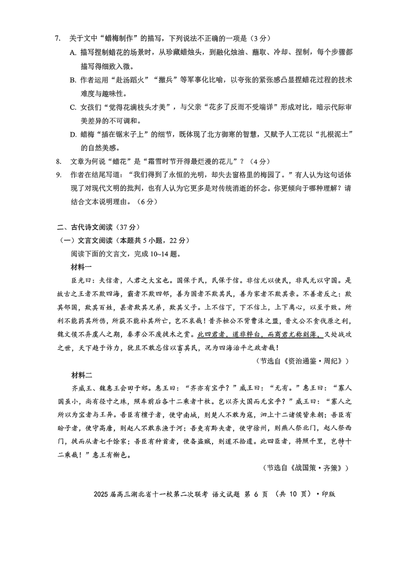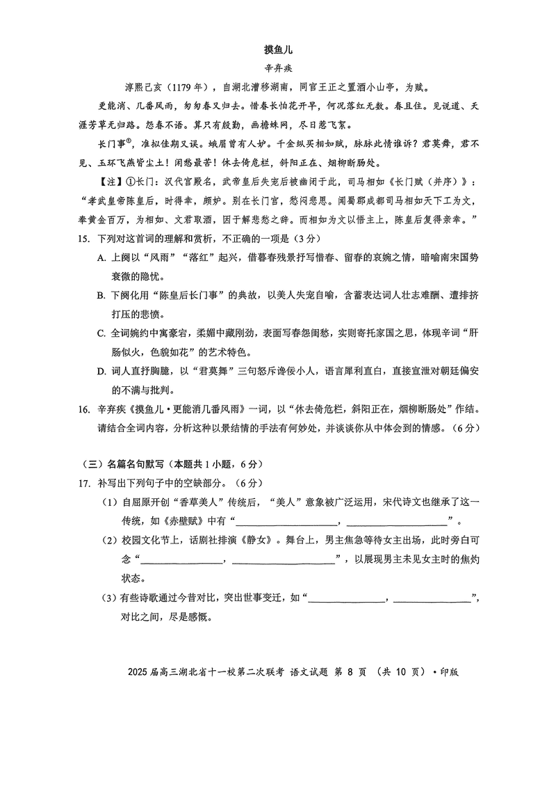 湖北省十一校2025届高三第二次联考语文试题及答案汇总 时间:2025-03-27 湖北 语文试题 湖北省十一校2025届高三第二次联考语文考试已于近日开考,为方便考生考后及时查看考试情况,查漏补缺、弥补不足,本文整理了试题答案解析相关信息! 汇总:湖北省十一校2025届高三第二次联考试题及答案汇总 语文试题及答案解析