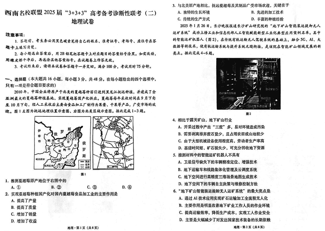 西南名校联盟2025届“3+3+3”高考备考诊断性联考 (二)地理试题及答案汇总