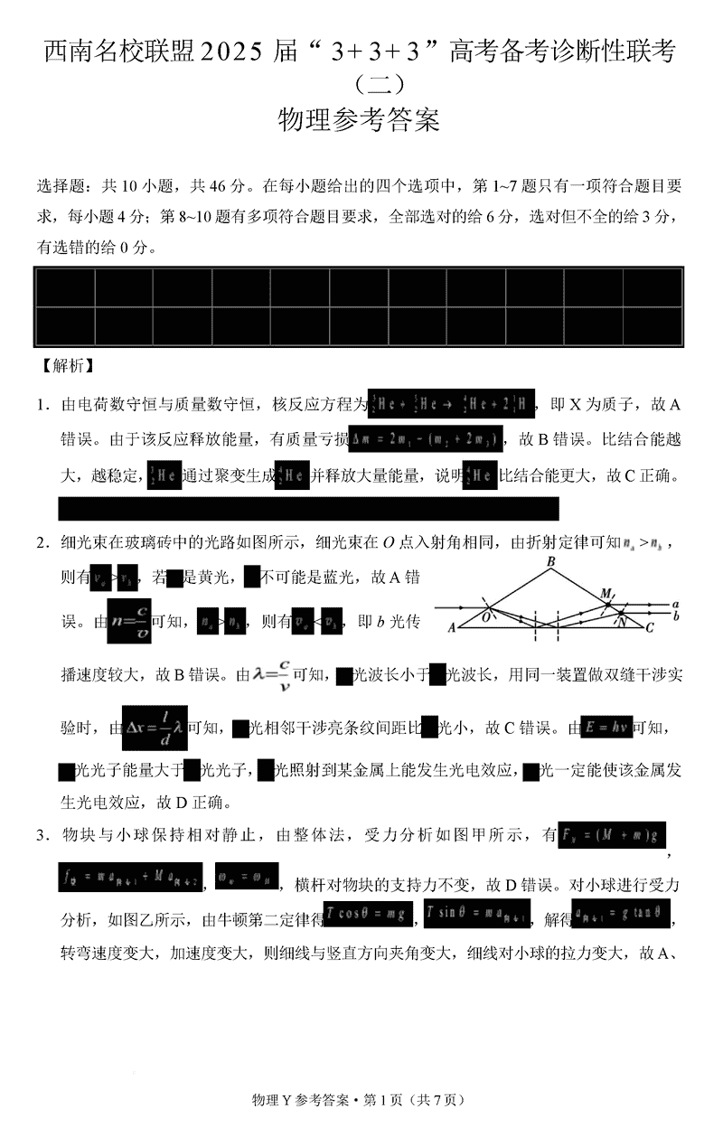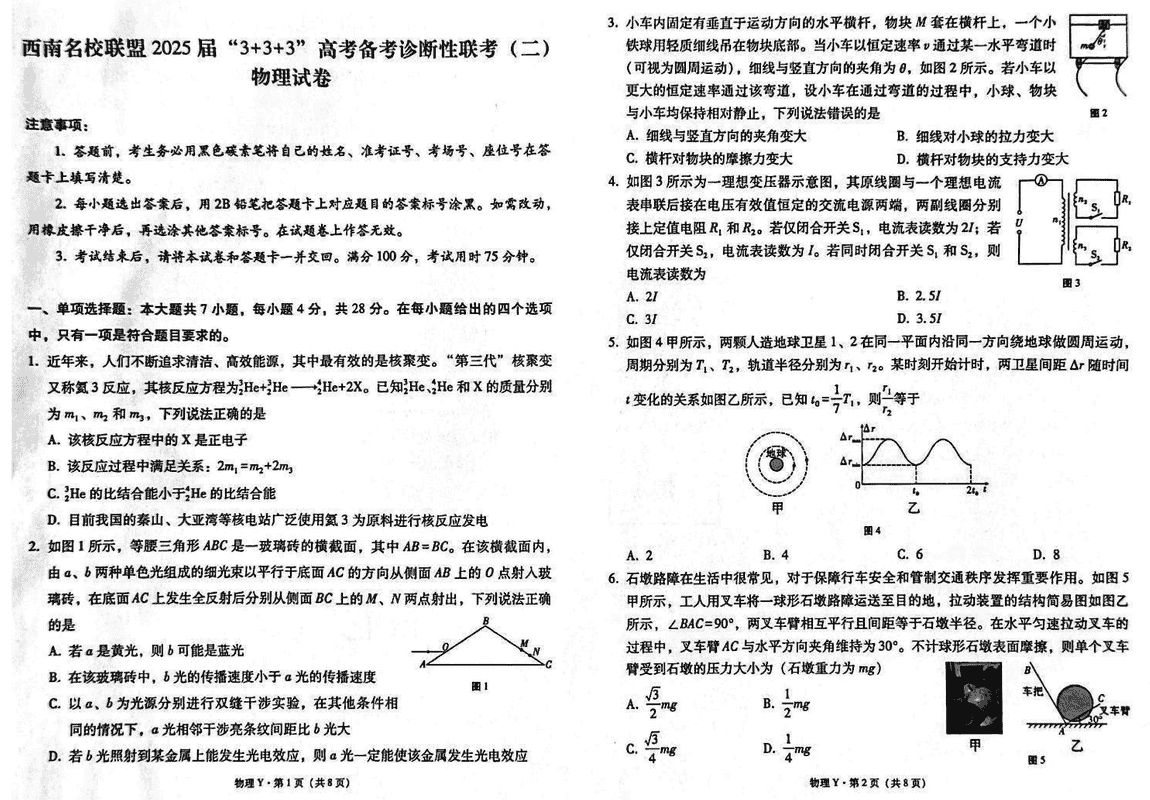 西南名校联盟2025届“3+3+3”高考备考诊断性联考 (二)物理试题及答案汇总