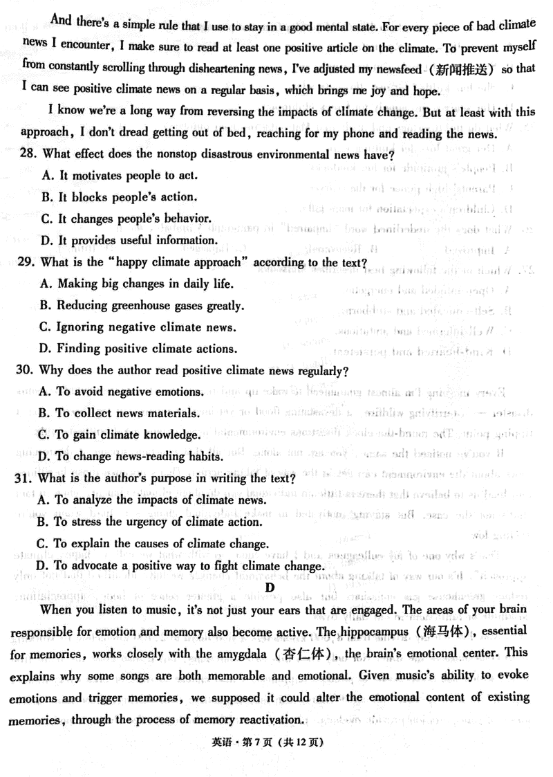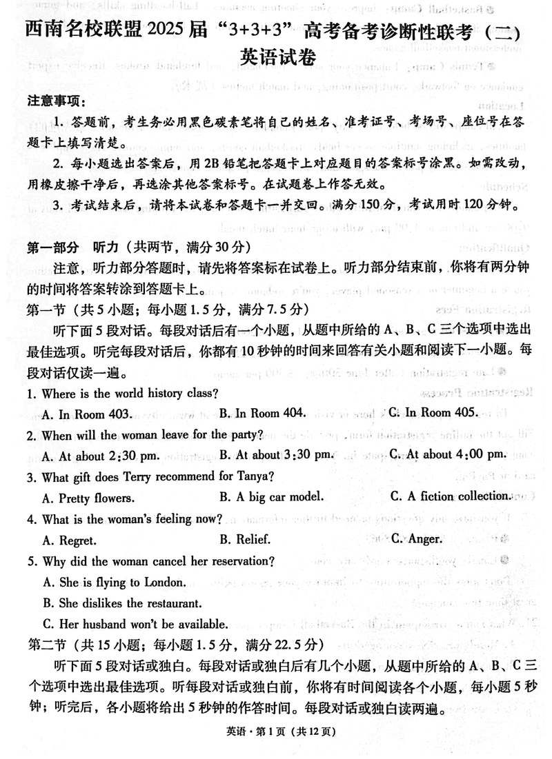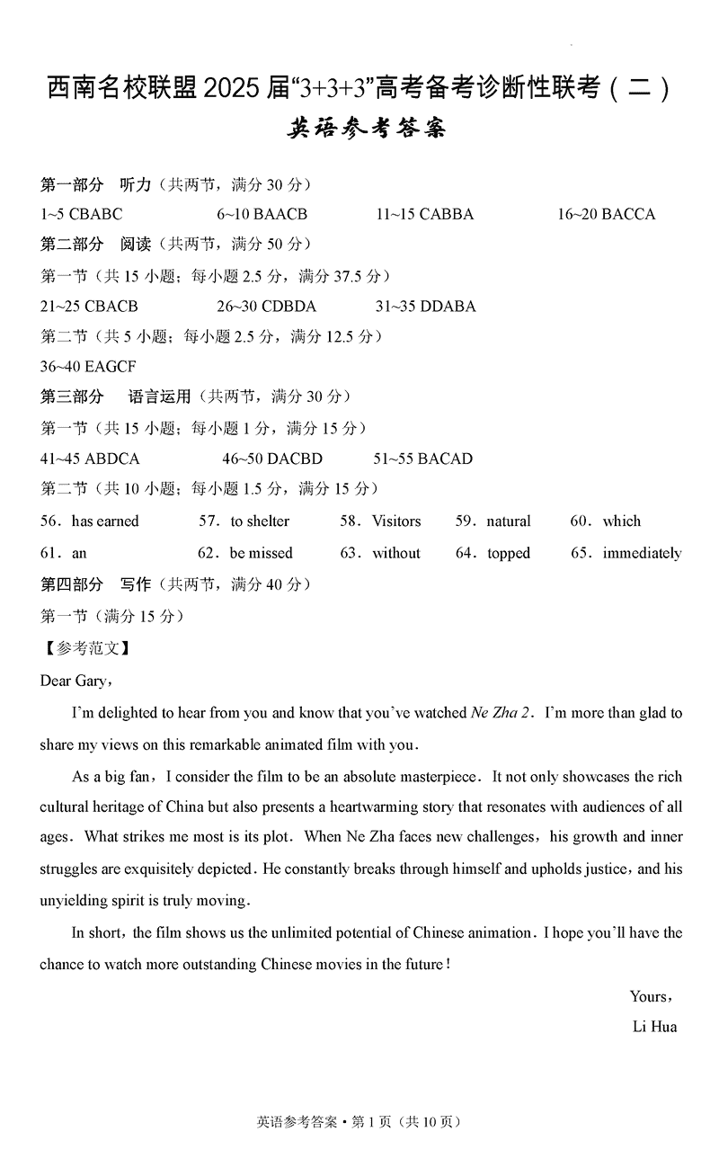 西南名校联盟2025届“3+3+3”高考备考诊断性联考 (二)英语试题及答案汇总