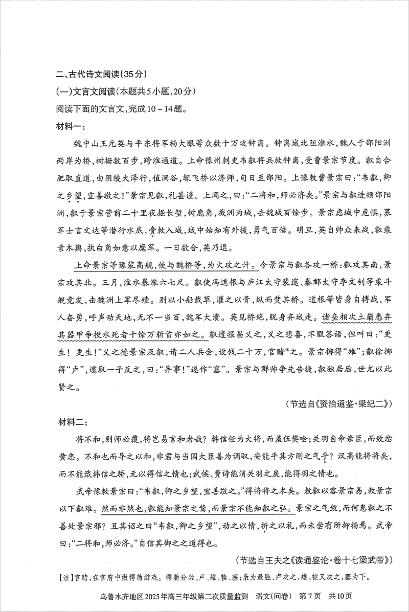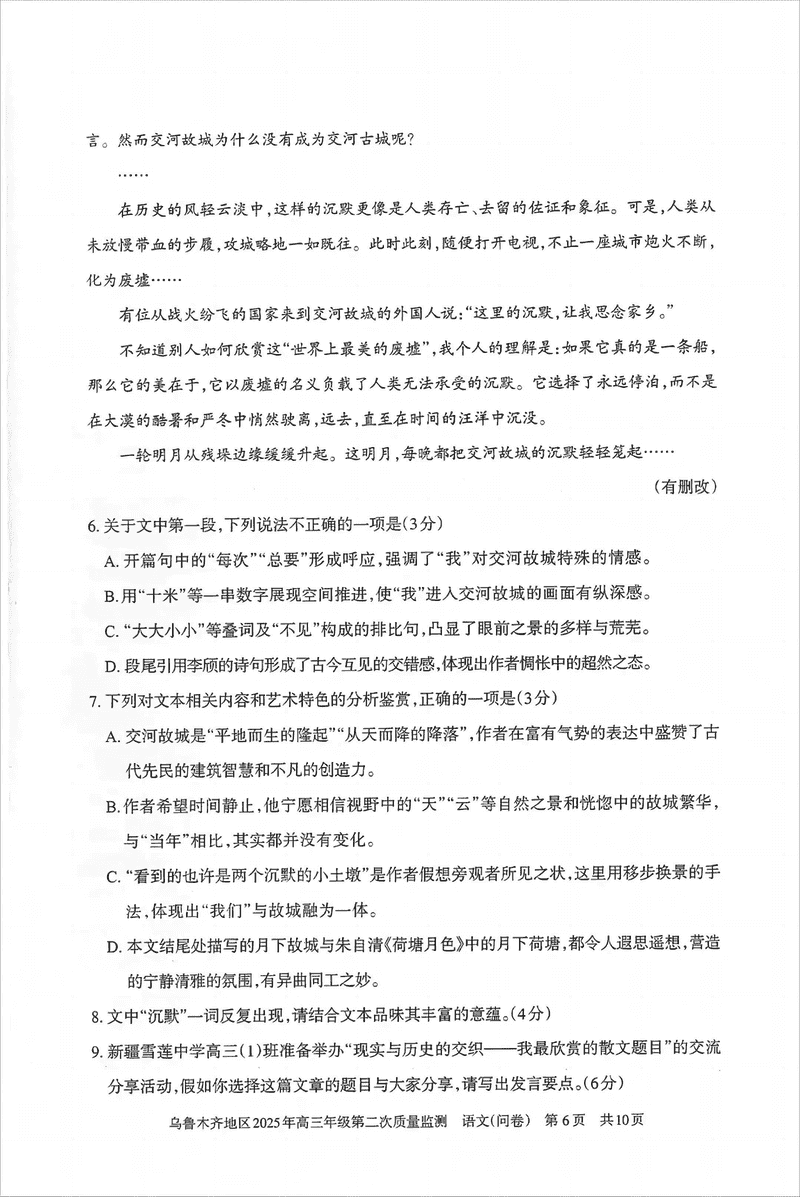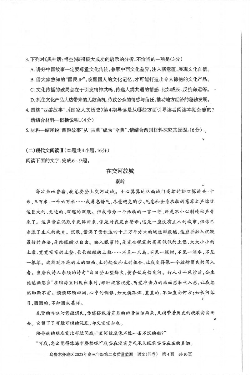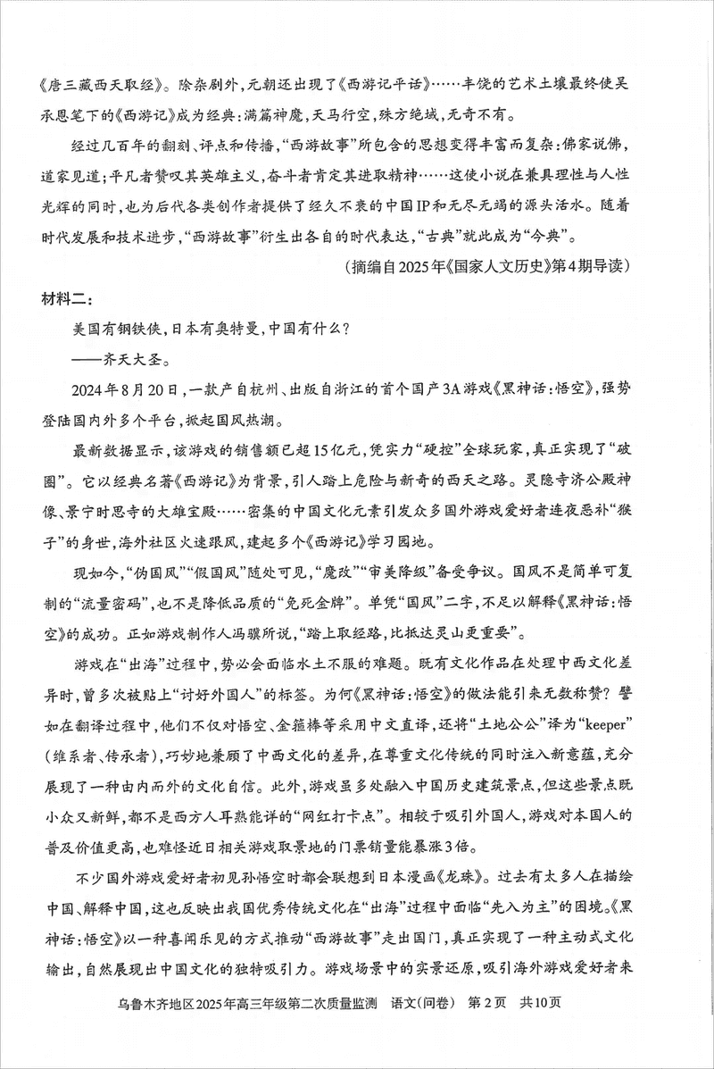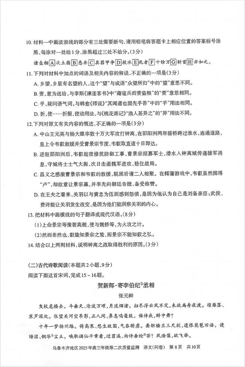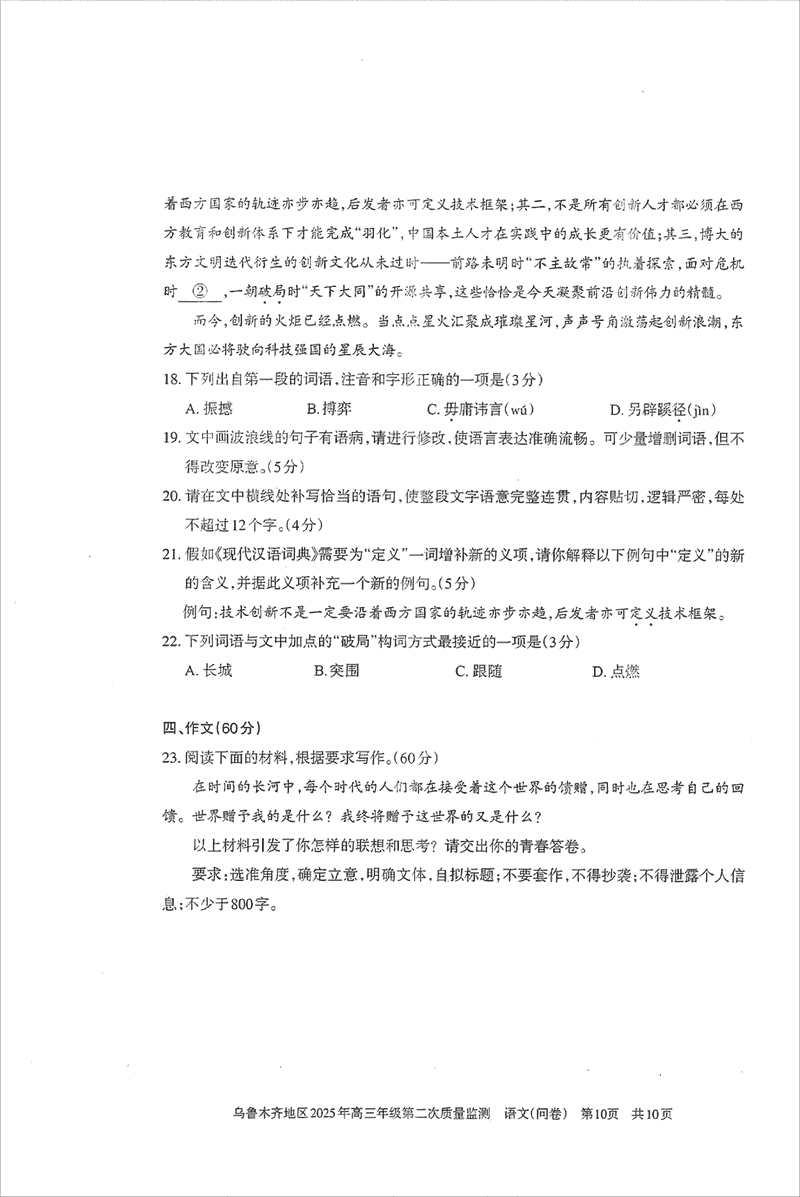 乌鲁木齐2025年高三第二次质量监测语文试题及答案汇总 时间:2025-03-27 新疆 语文试题 乌鲁木齐2025年高三第二次质量监测语文考试已于近日开考,为方便考生考后及时查看考试情况,查漏补缺、弥补不足,本文整理了试题答案解析相关信息! 汇总:乌鲁木齐2025年高三第二次质量监测试题及答案汇总 语文试题及答案解析