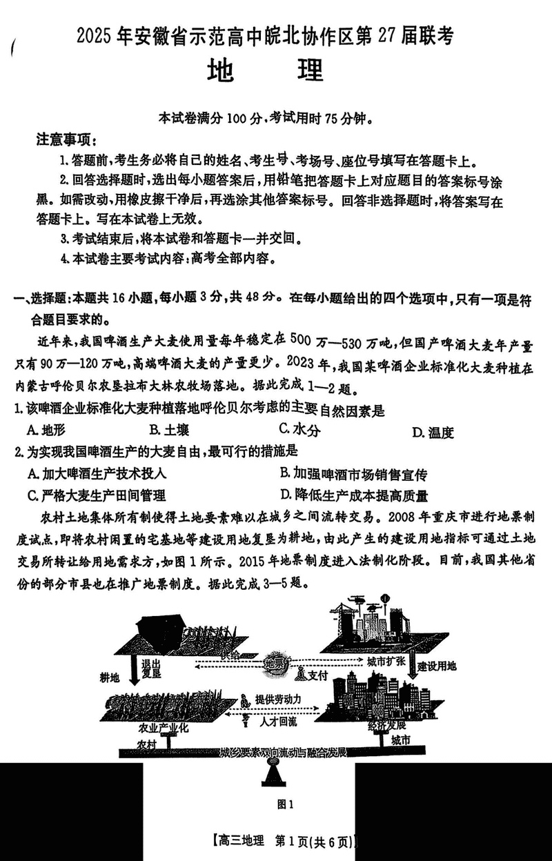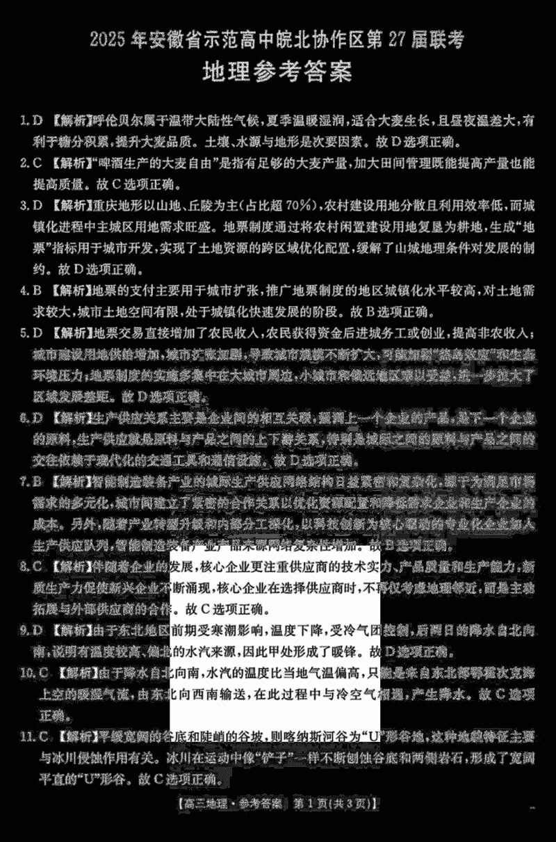 2025年安徽省示范高中皖北协作区第27届联考地理试题及答案汇总