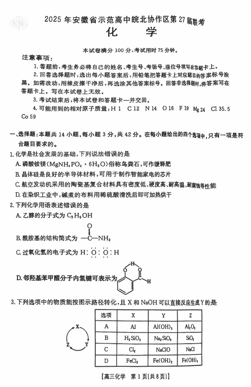 2025年安徽省示范高中皖北协作区第27届联考化学试题及答案汇总