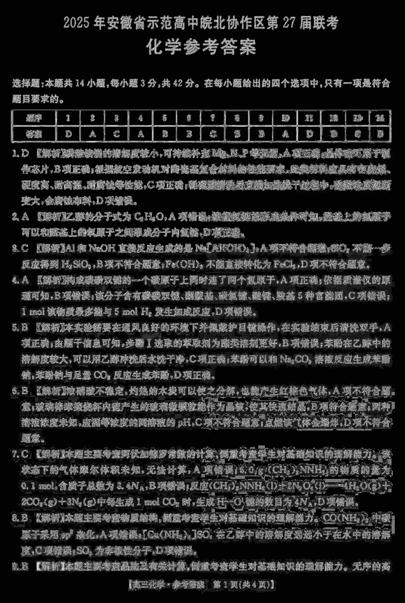 2025年安徽省示范高中皖北协作区第27届联考化学考试已于近日开考,为方便考生考后及时查看考试情况,查漏补缺、弥补不足,本文整理了试题答案解析相关信息!